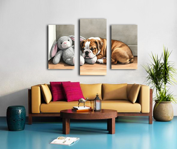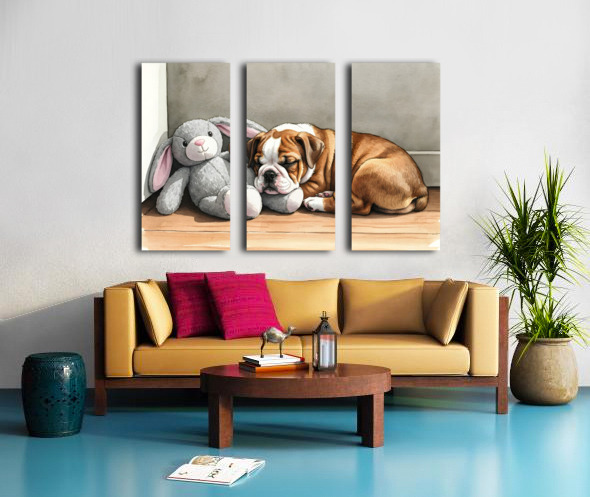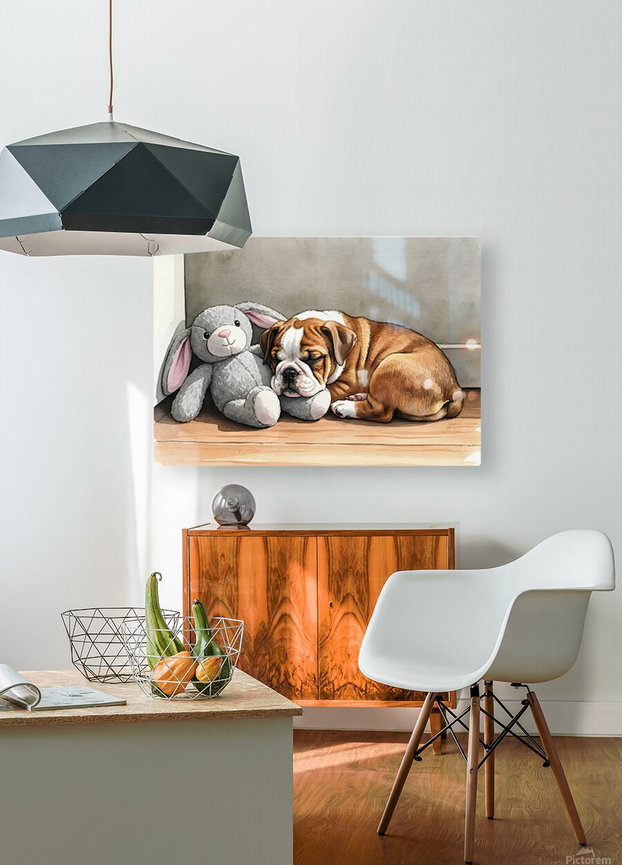 Bulldog Puppy Naps With His Beloved Rabbit Friend Impression sur toile