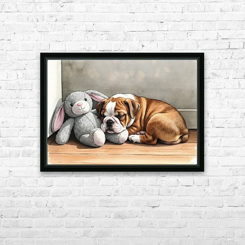 Bulldog Puppy Naps With His Beloved Rabbit Friend Impression du cadre