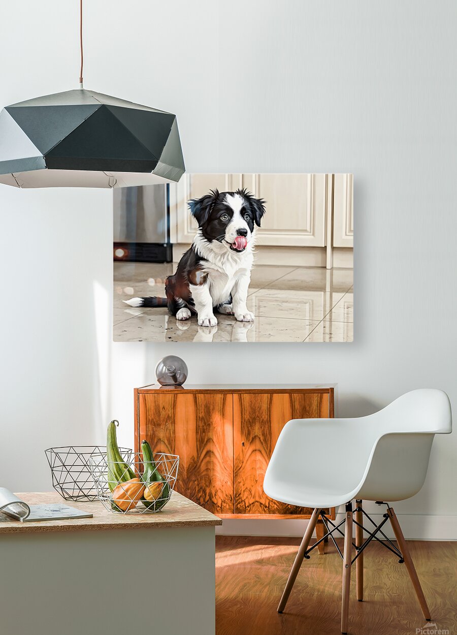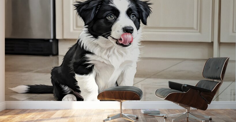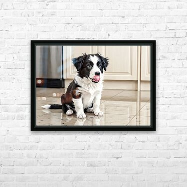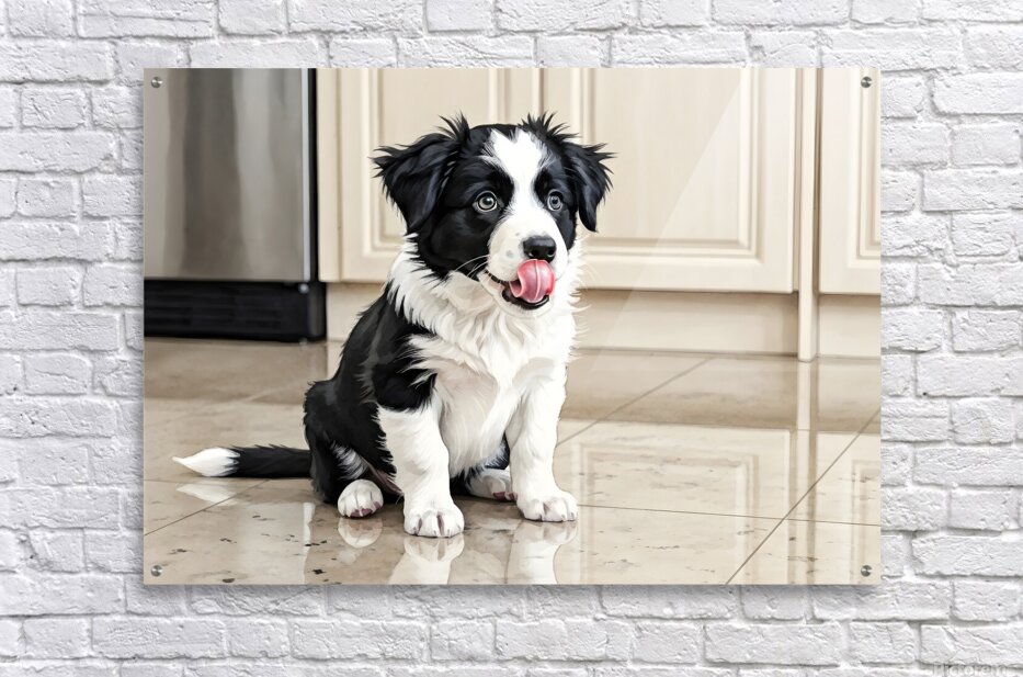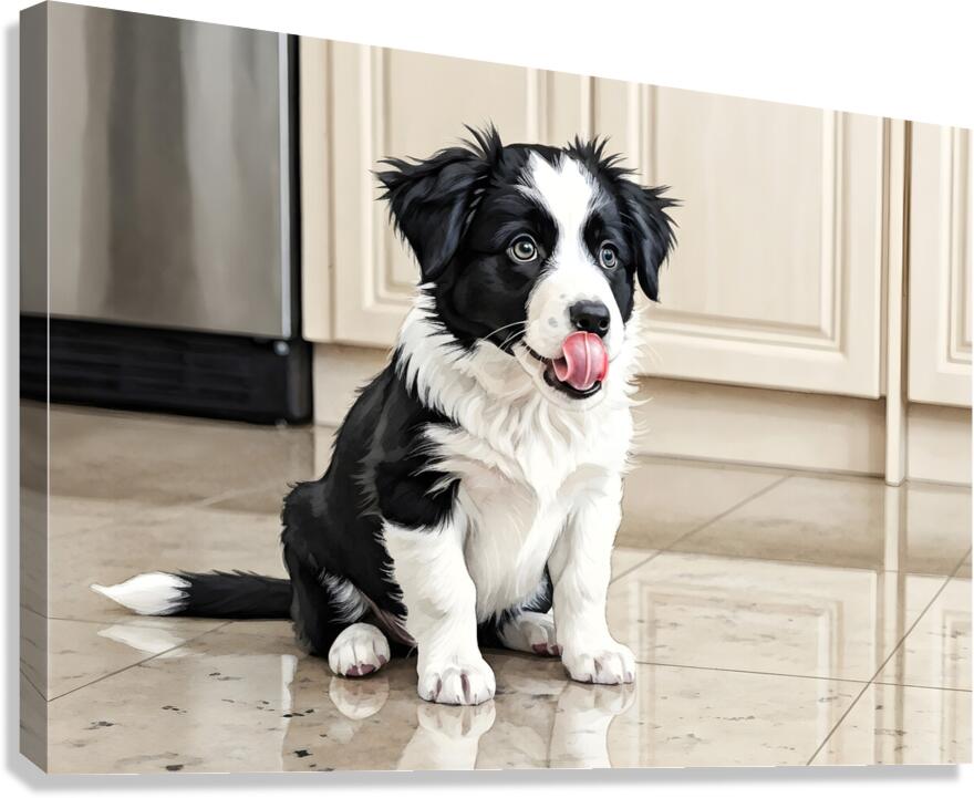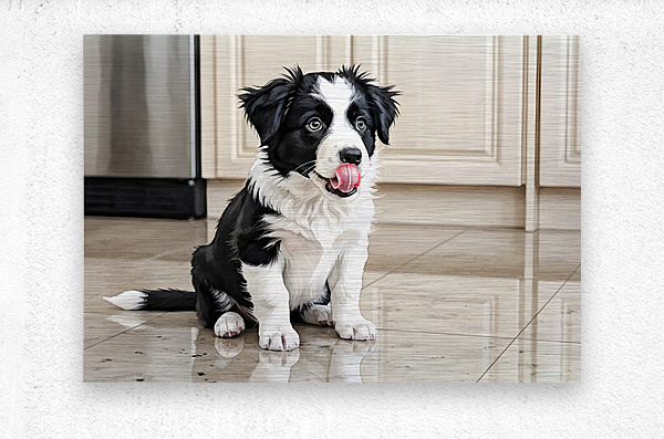 A fluffy black and white Border Collie puppy sits on a tiled kitchen floor its pink tongue darting out to lick its lips in anticipation. The young dogs bright eyes are focused upward with hopeful excitement. Digital Artwork.
