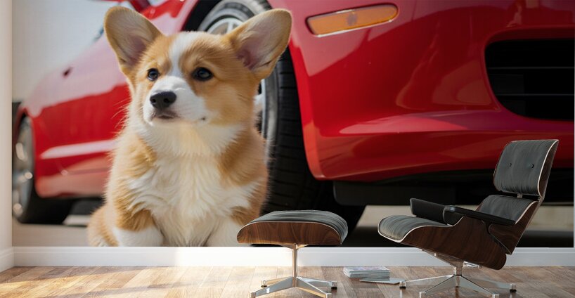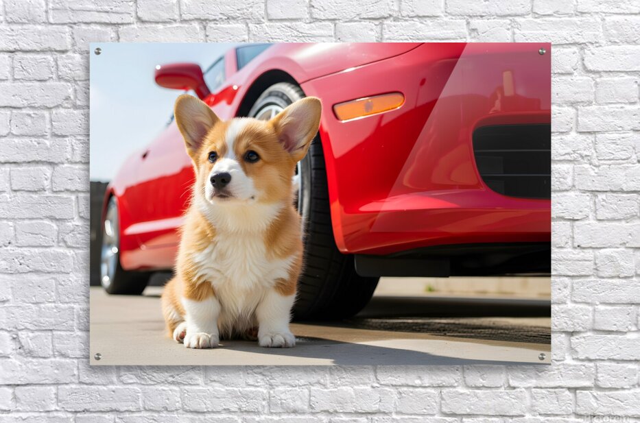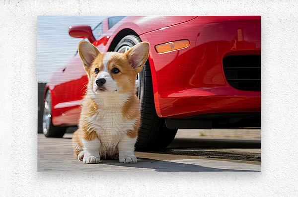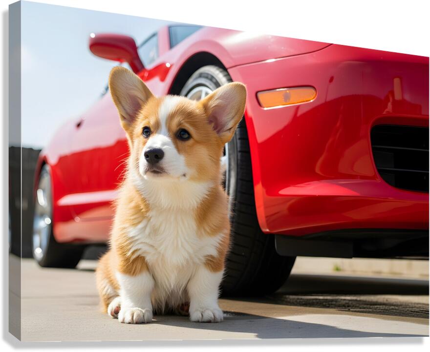 The orange and white Pembroke Welsh Corgi puppy sits proudly with its damp fur glistening in the warm sunlight. Both the puppy and the red car behind it are now clean and sparkling after their washing adventure. Digital Artwork.