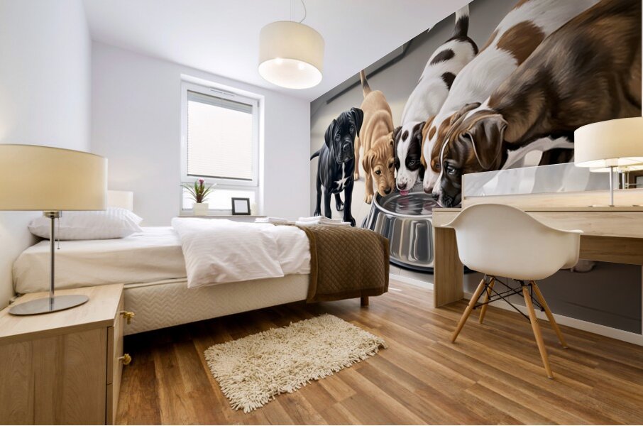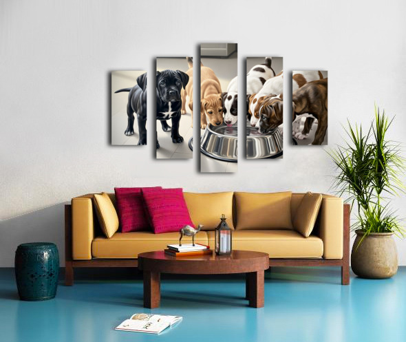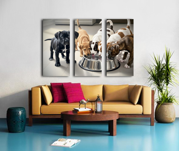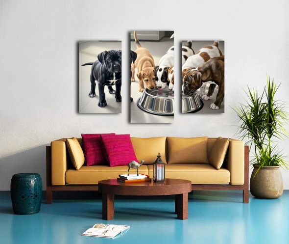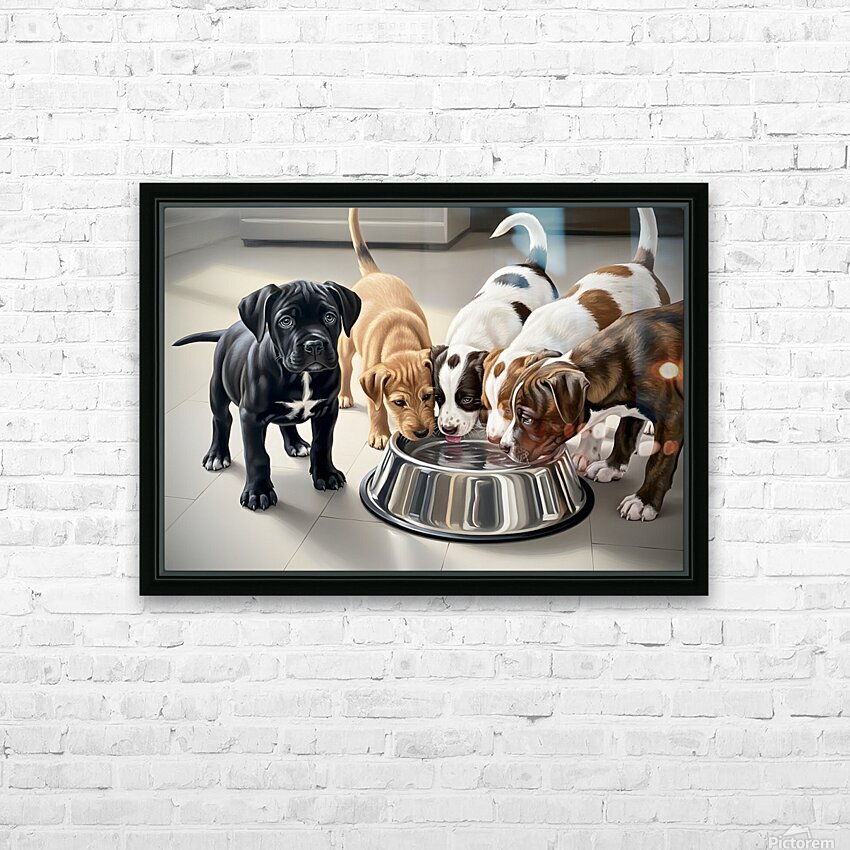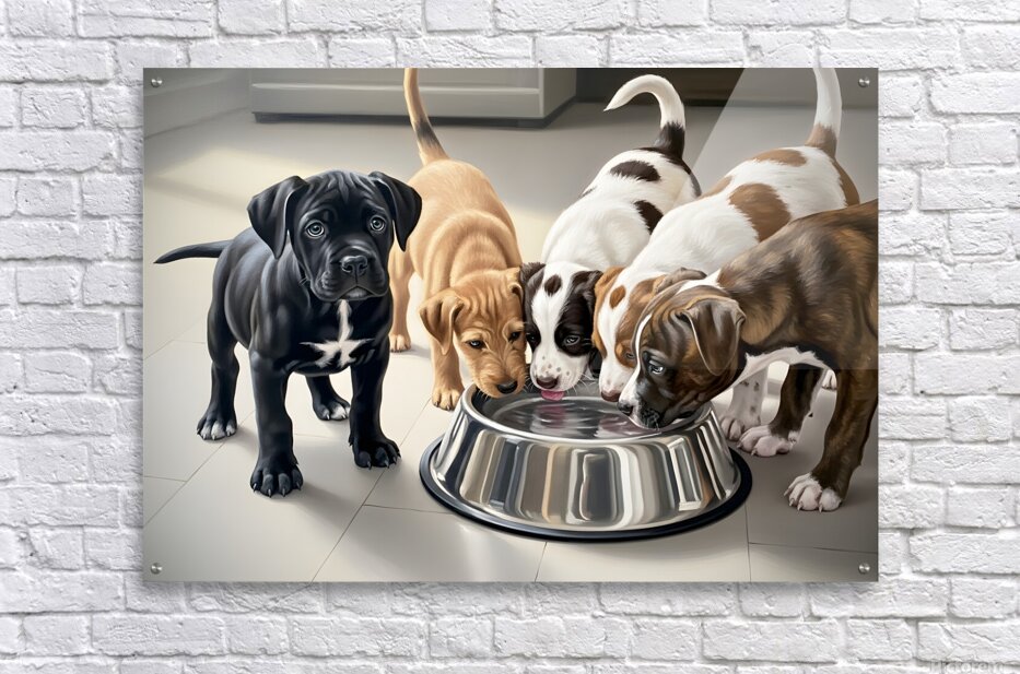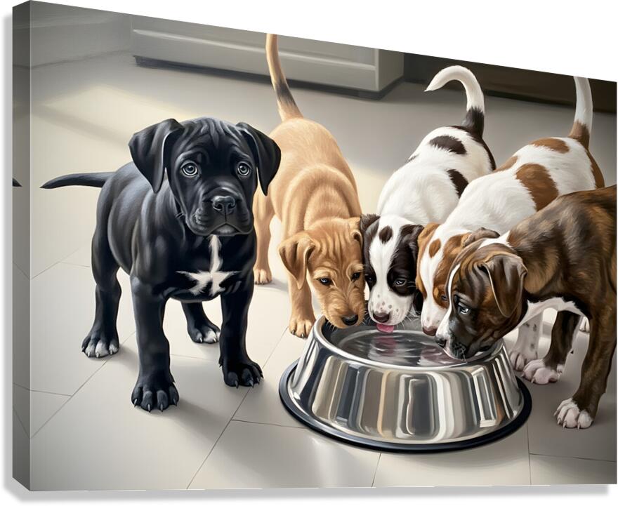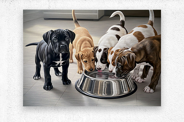 A young black Cane Corso puppy with soft floppy ears stands patiently at the edge of a metal water bowl while several other colorful puppies crowd around drinking water. The indoor setting has gentle lighting that highlights the puppies fur. Digital Artwork.