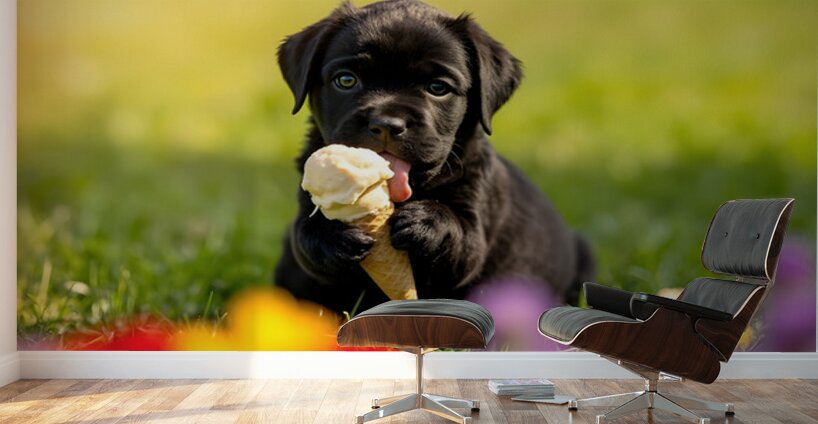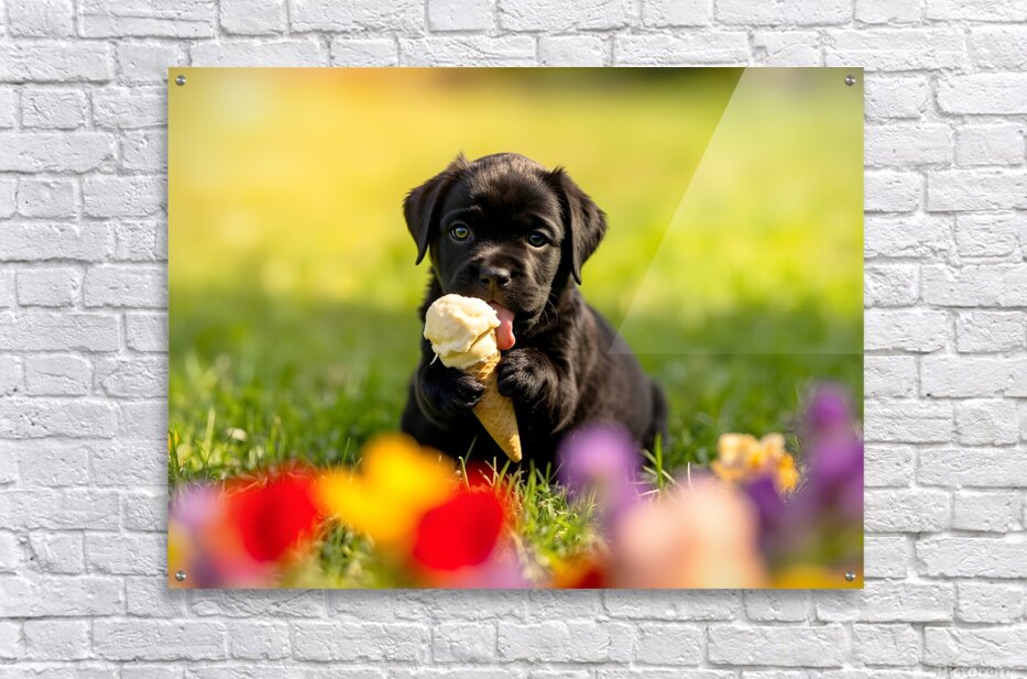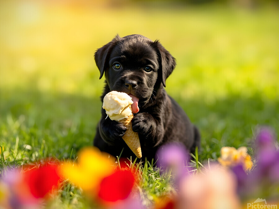 A adorable black Cane Corso puppy sits on vibrant green grass gripping a creamy vanilla ice cream cone between its small paws. The puppys pink tongue is extended eagerly toward the frozen treat with bright brown eyes full of excitement and curiosity about this new discovery. Digital Artwork.
