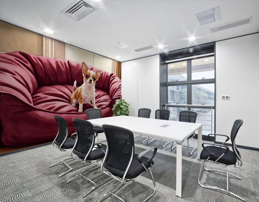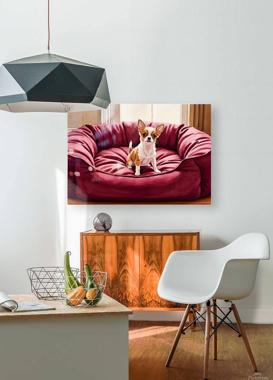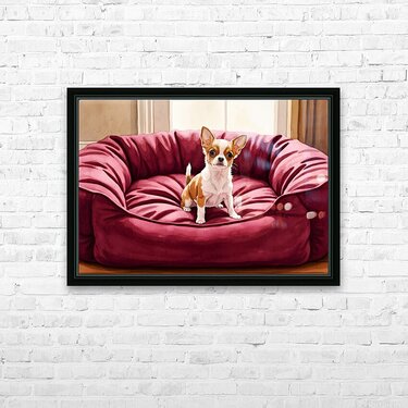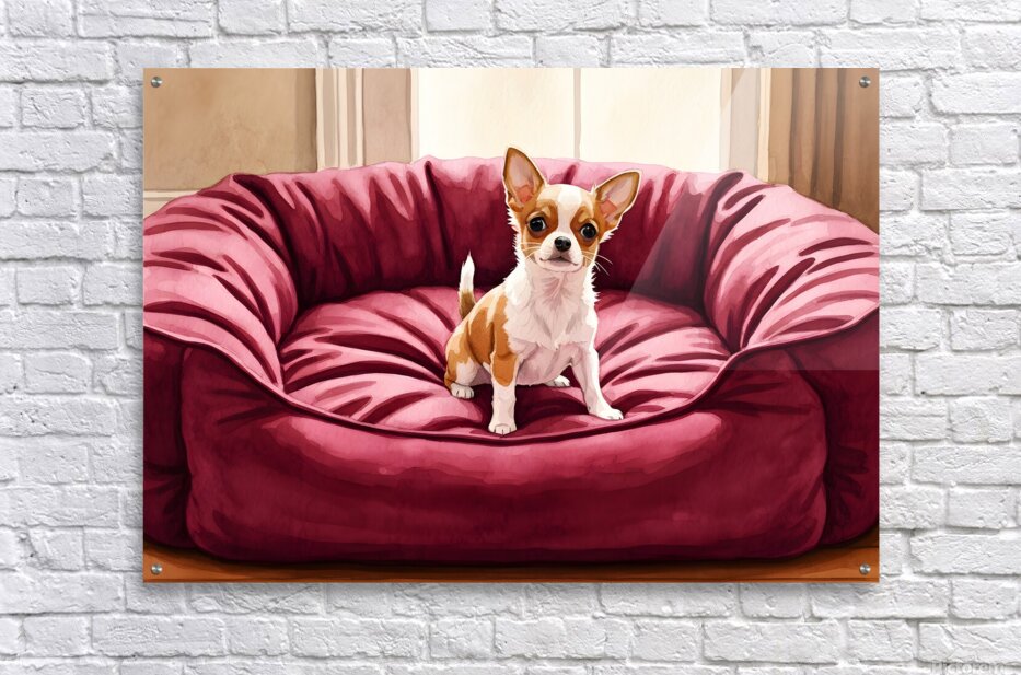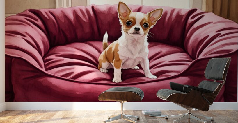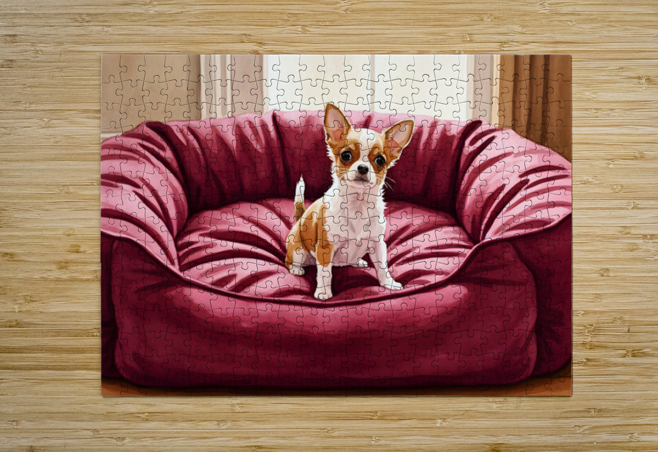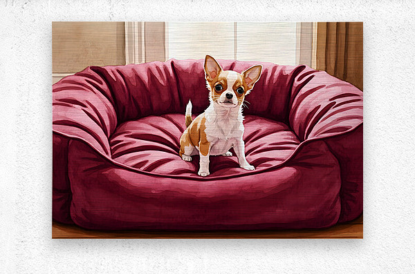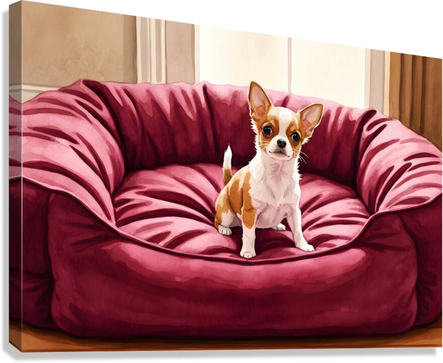 A small tan and white Chihuahua puppy sits in the middle of a massive burgundy dog bed. The bed appears comically oversized compared to the tiny puppy who looks adorable and curious in the plush surroundings. Digital Artwork.