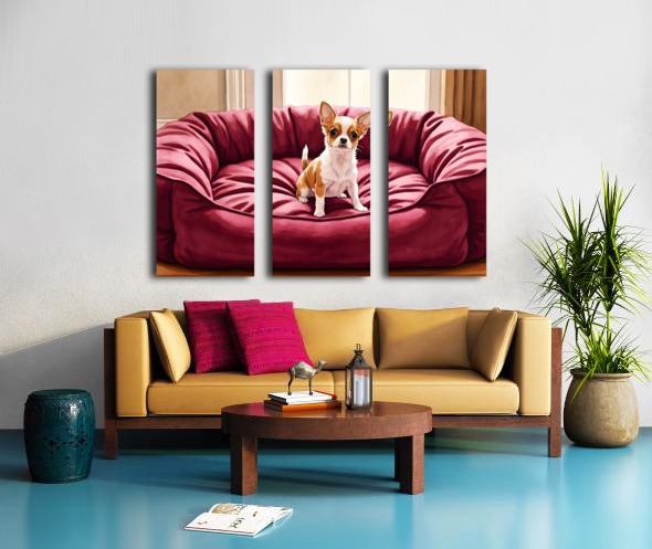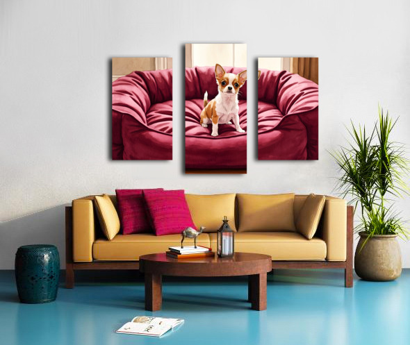 Tiny Chihuahua Puppy Discovers Giant Dog Bed Impression sur toile