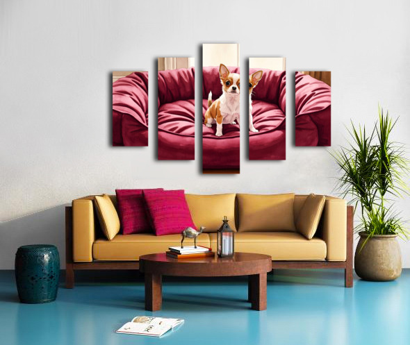 SUR CETTE OEUVRE: TINY CHIHUAHUA PUPPY DISCOVERS GIANT DOG BED