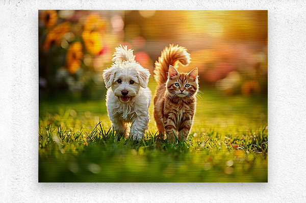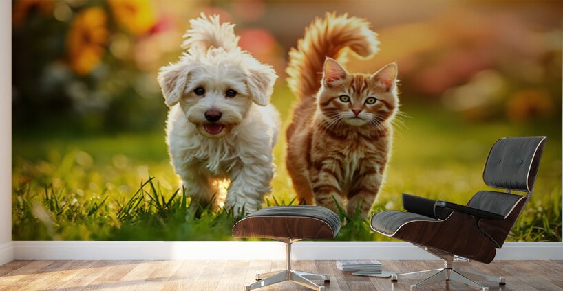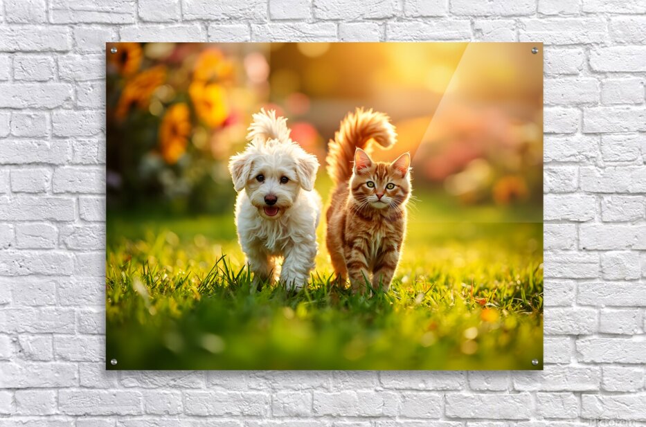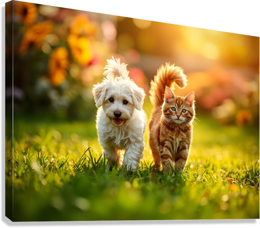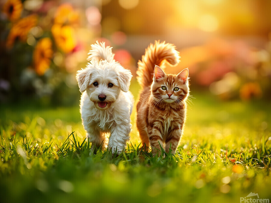 SUR CETTE OEUVRE: BICHON FRISE PUPPY AND CAT WALK TOGETHER AS FRIENDS
