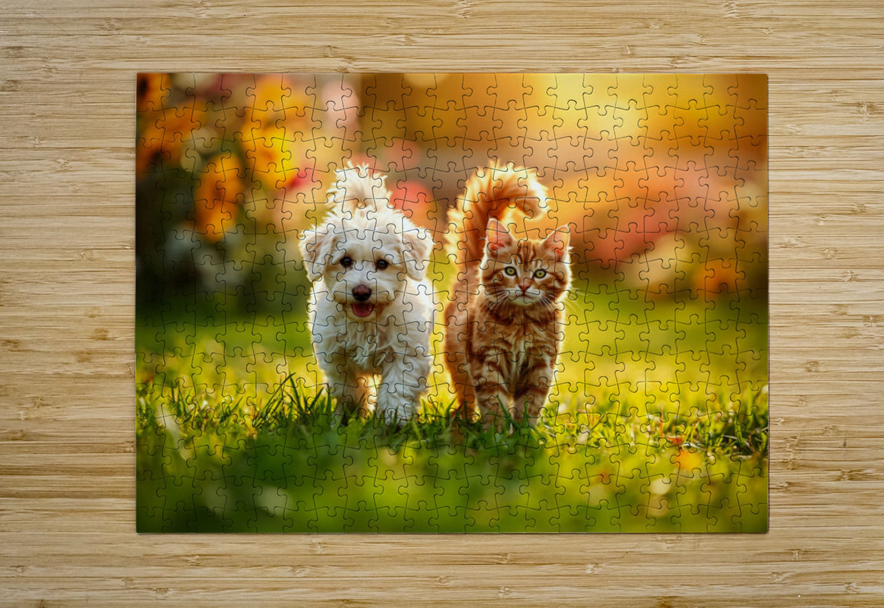 Bichon Frise Puppy And Cat Walk Together As Friends Puppy Prints Impression de puzzle