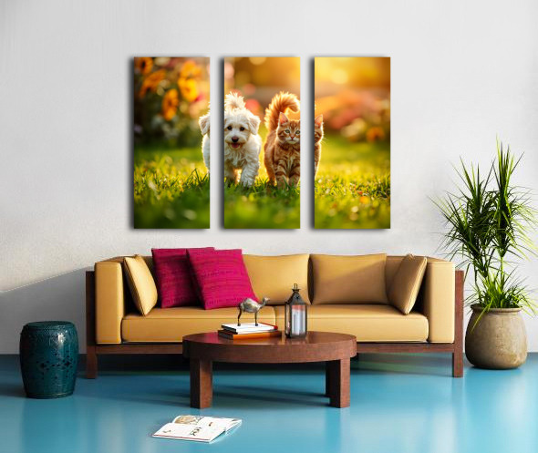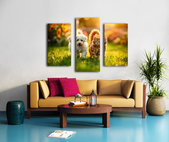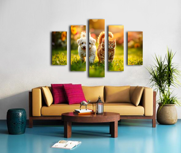 Bichon Frise Puppy And Cat Walk Together As Friends Impression sur toile