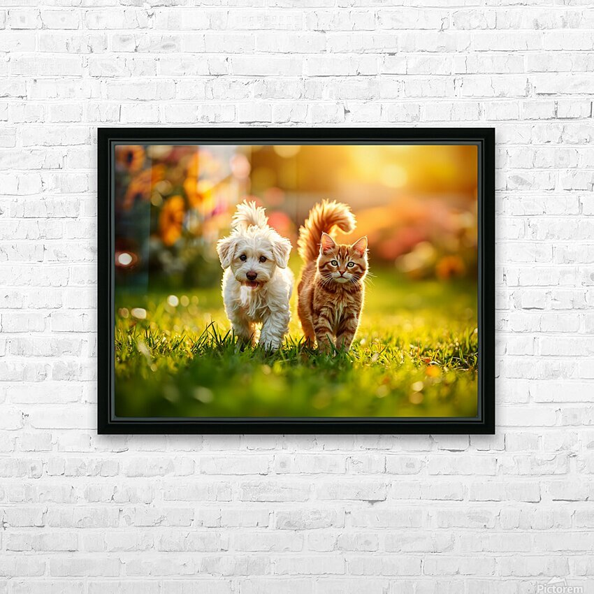 Bichon Frise Puppy And Cat Walk Together As Friends Impression du cadre