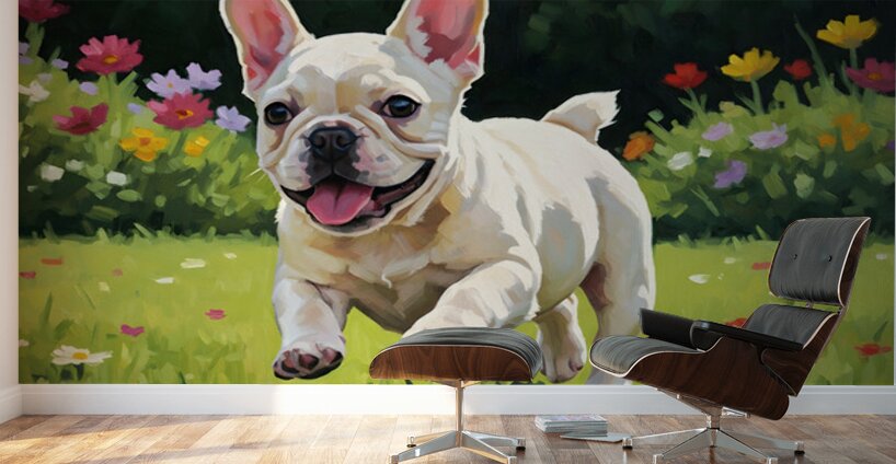 A cream-colored French Bulldog puppy runs joyfully across green grass in a bright backyard. The puppys tongue hangs out happily as it moves with soft-focus flowers creating a colorful blur in the foreground. Digital Artwork.