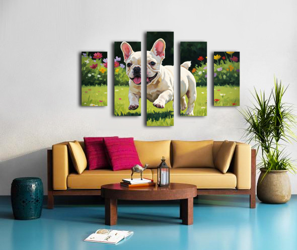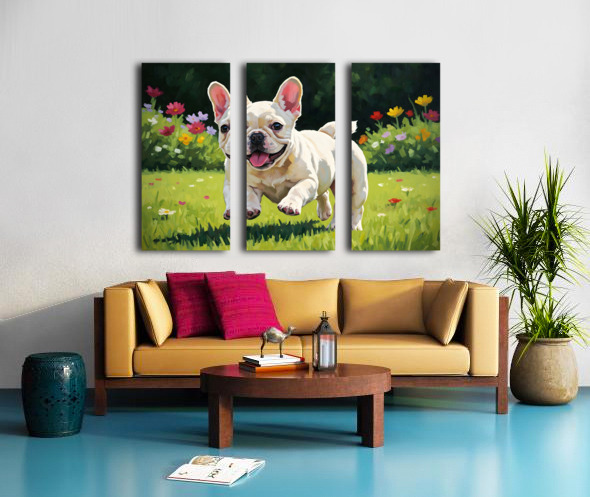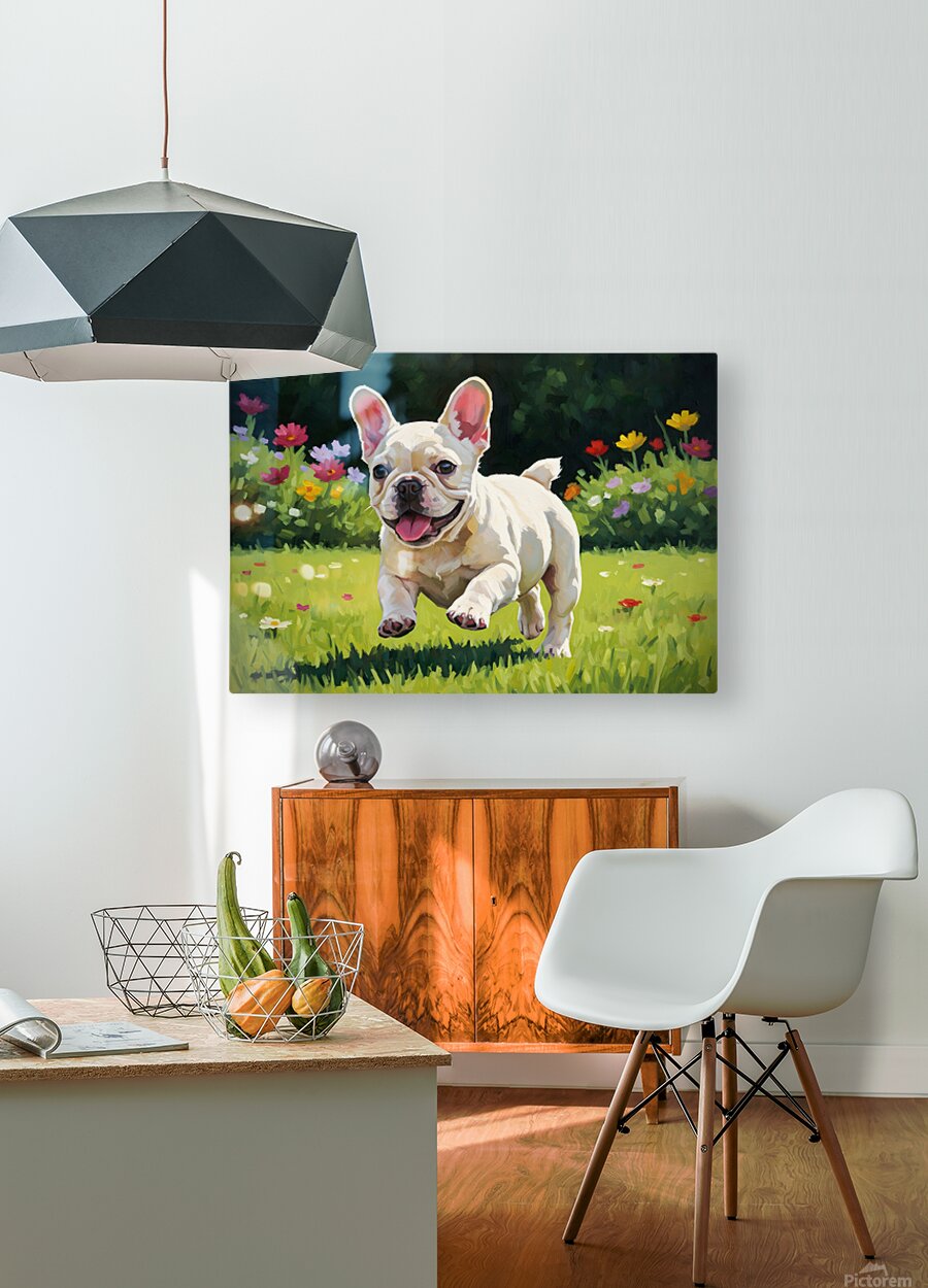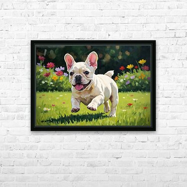 SUR CETTE OEUVRE: FRENCH BULLDOG PUPPY RUNNING IN SUNNY YARD