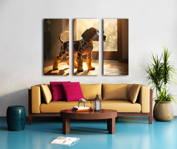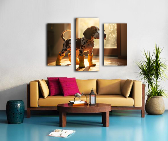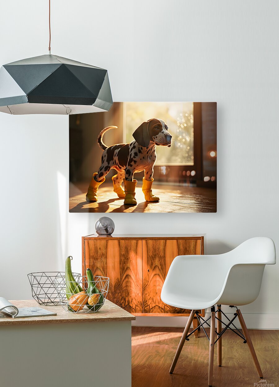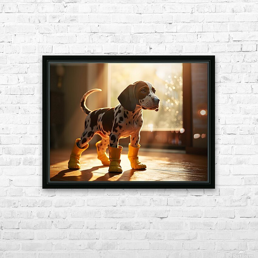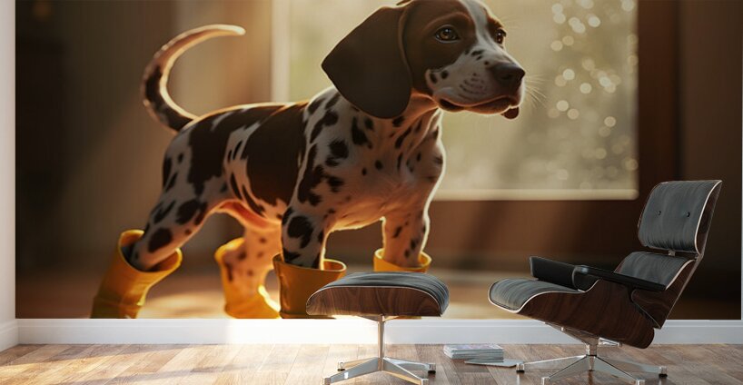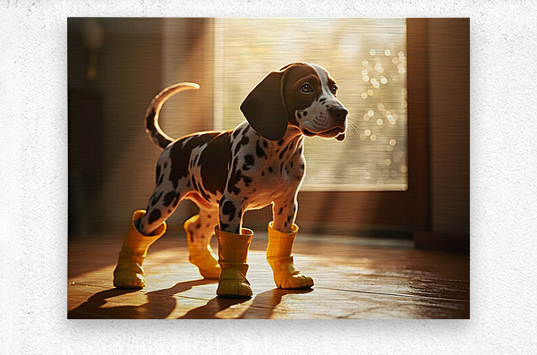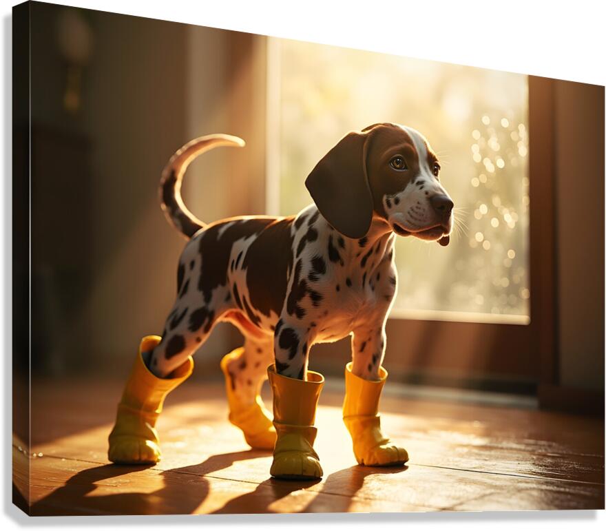 An adorable German Shorthaired Pointer puppy with distinctive brown and white markings stands indoors wearing cheerful yellow rain boots tail wagging with excitement as raindrops streak down the window behind Digital Artwork.