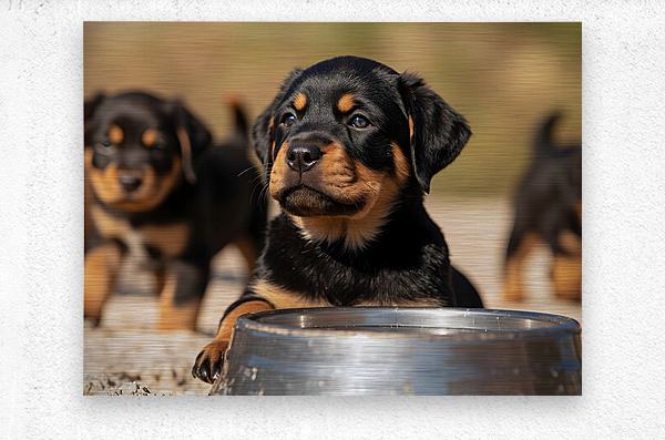 The happy black and tan Rottweiler puppy sits contentedly with water droplets still glistening on his chin. He looks completely refreshed and satisfied after his drink as other puppies wander away. Digital Artwork.