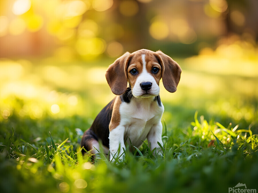 A curious young beagle puppy with distinctive tri-color markings sits on lush green grass in a bright backyard setting. The small dog appears confused...[+]
