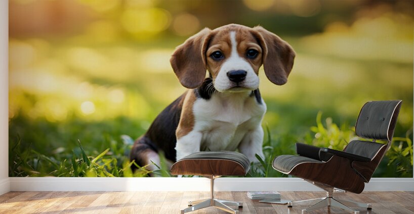 A curious young beagle puppy with distinctive tri-color markings sits on lush green grass in a bright backyard setting. The small dog appears confused and alert beginning to turn around as if detecting something mysterious following behind. Digital Artwork.