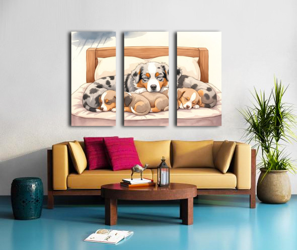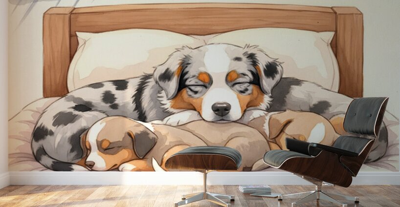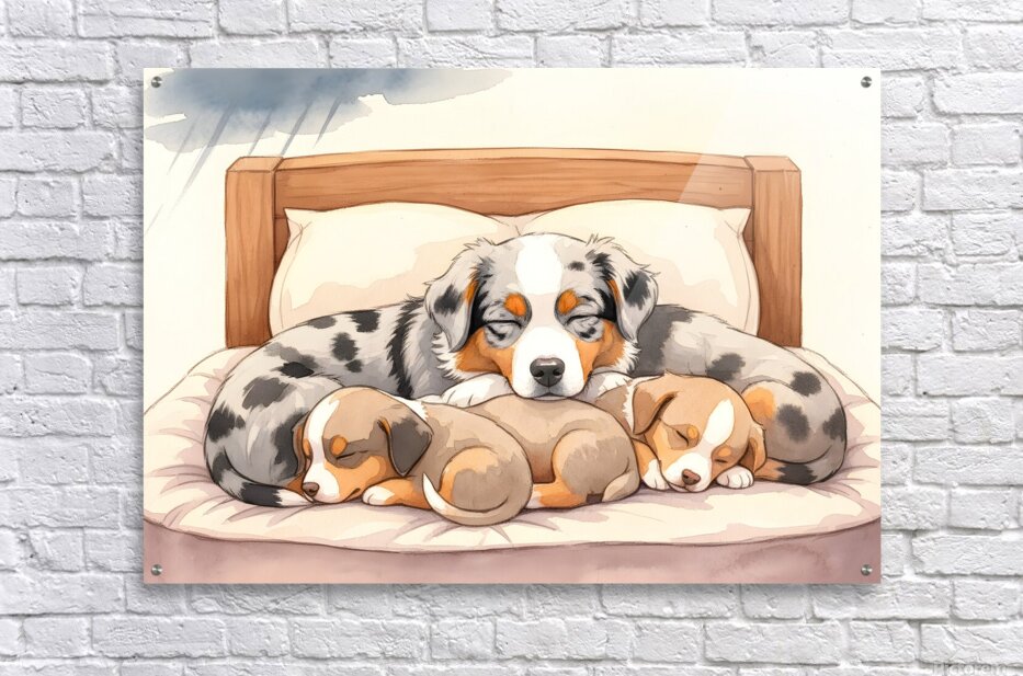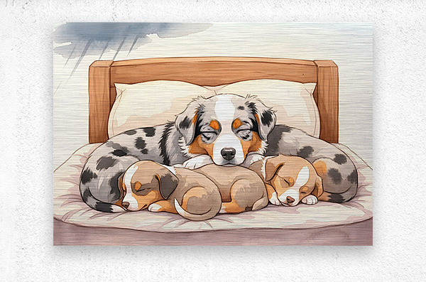 The blue merle Australian Shepherd puppy displays contentment with sleepy half-closed blue eyes as all siblings rest peacefully together. Warm lighting bathes the wooden bed where they sleep soundly after weathering the storm together. Digital Artwork.