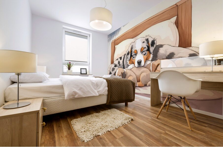 SUR CETTE OEUVRE: SLEEPY AUSTRALIAN SHEPHERD PUPPY RESTS AFTER STORM