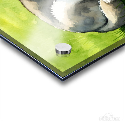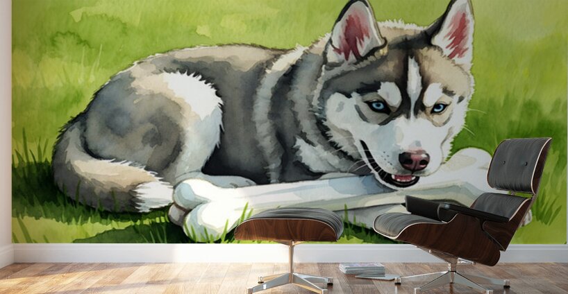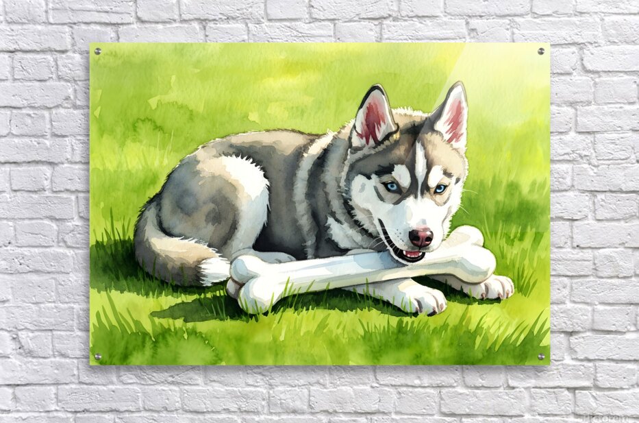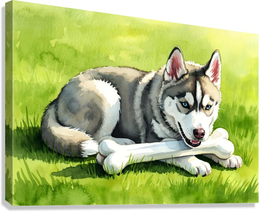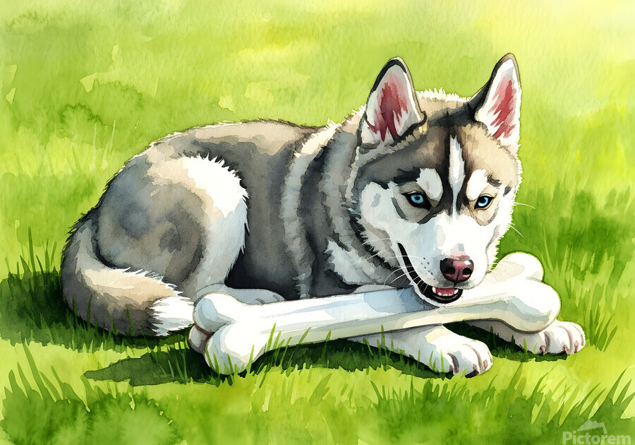 The satisfied gray and white Husky puppy with bright blue eyes rests peacefully beside the large white bone finally able to enjoy its prize. The puppy gnaws contentedly on one end while its fluffy coat catches the warm sunlight on the green grass. Digital Artwork.