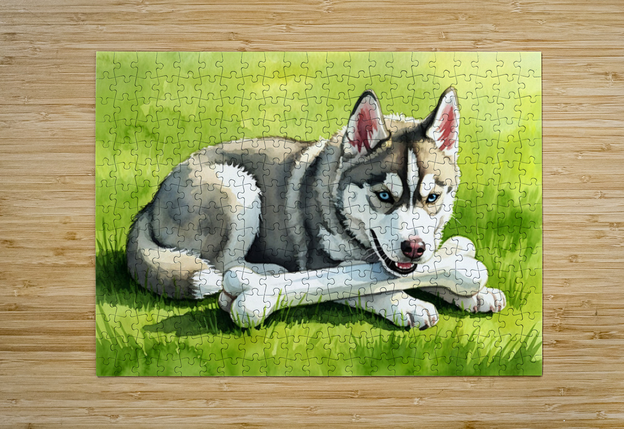 Content Husky Puppy Enjoys Victory With Bone Puppy Prints Impression de puzzle