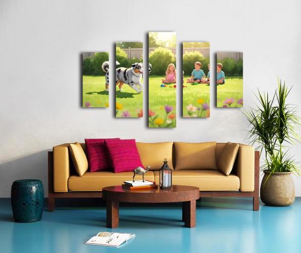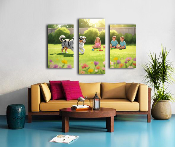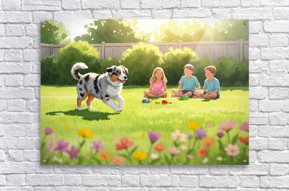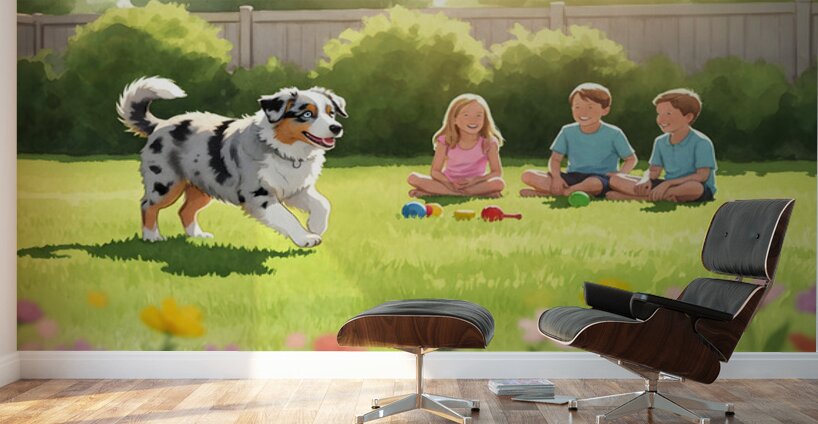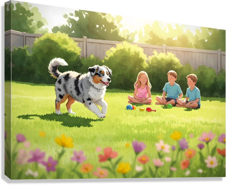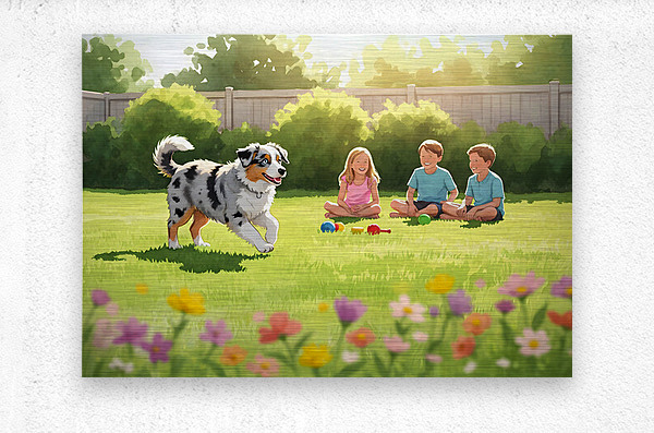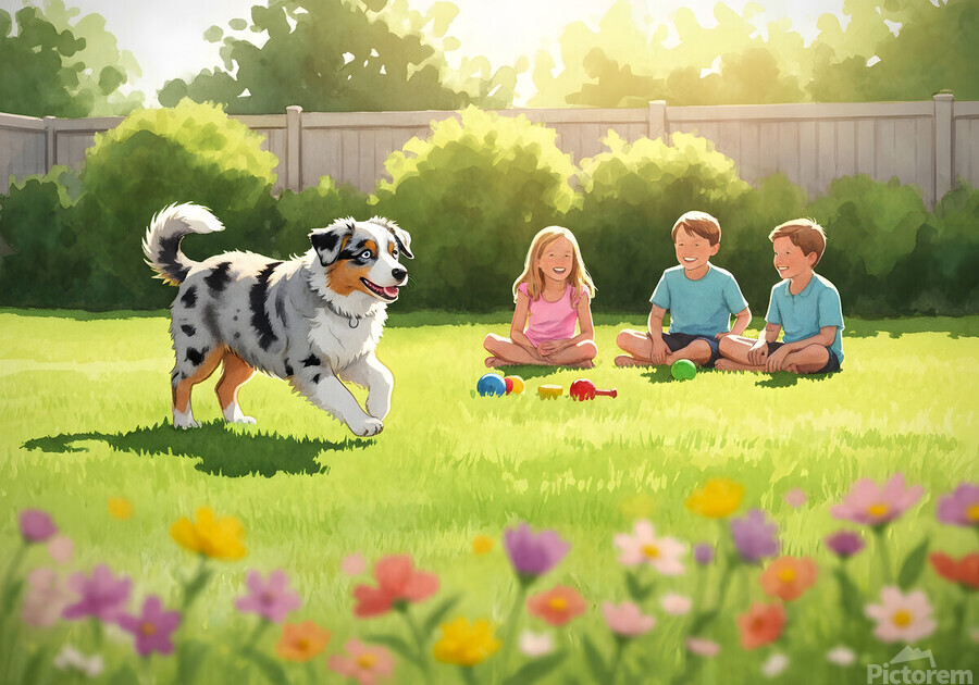 A beautiful blue merle Australian Shepherd puppy with striking blue eyes bounds eagerly across green grass toward a group of young children in a bright sunny backyard setting with toys nearby Digital Artwork.