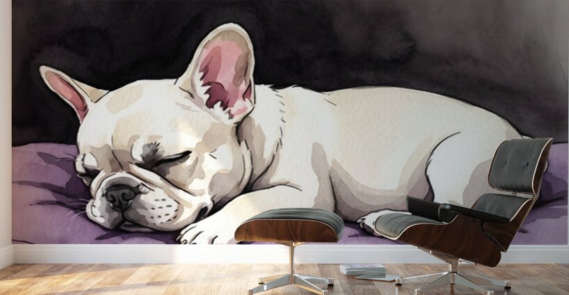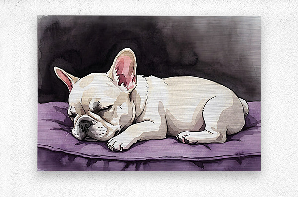 A cream-colored French Bulldog puppy rests deeply on a purple cushion sleeping soundly on its side with characteristic wrinkled face relaxed in peaceful slumber Digital Artwork.
