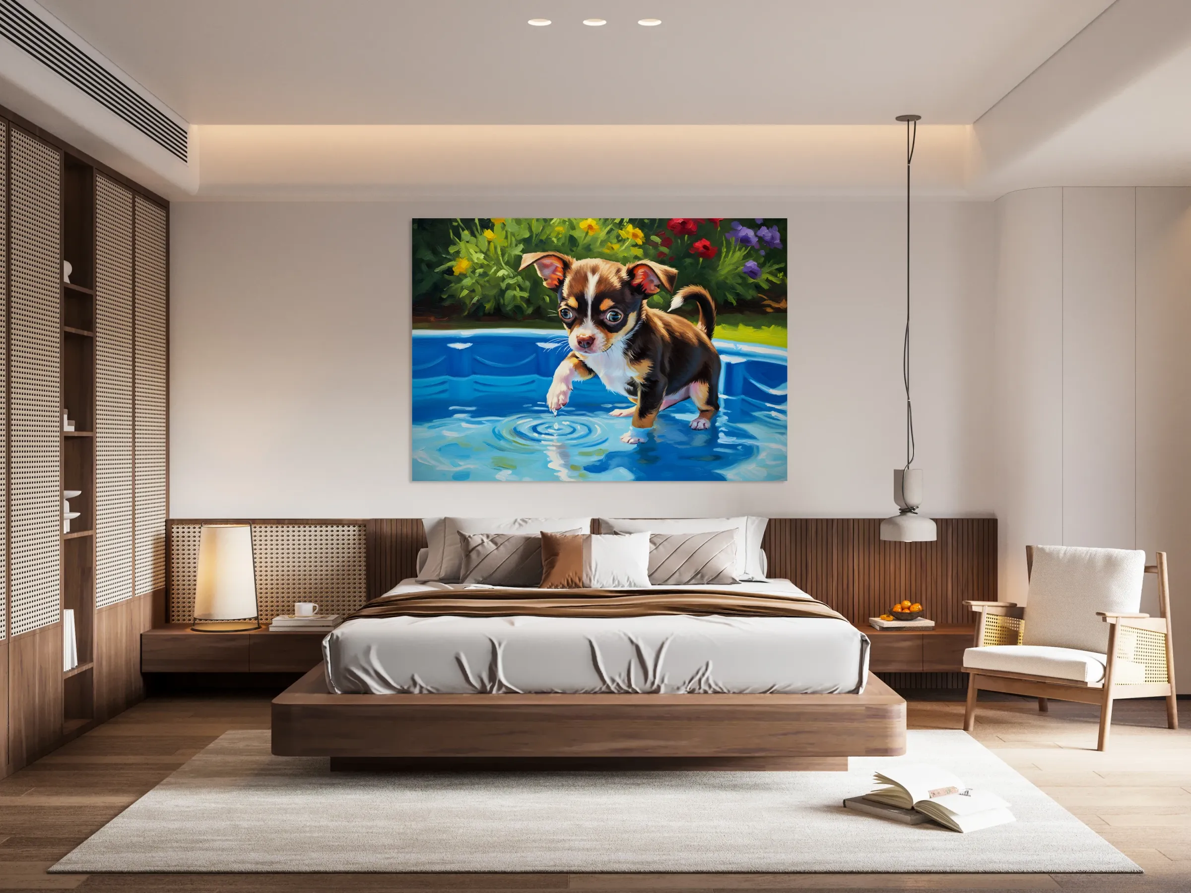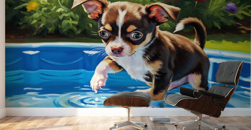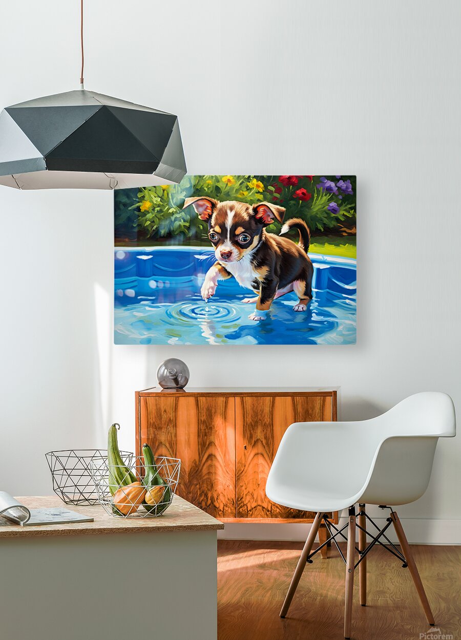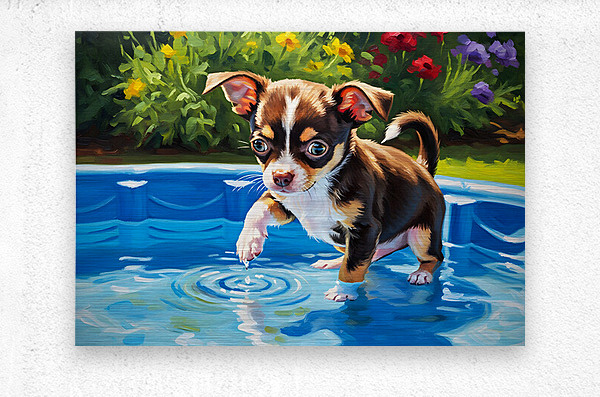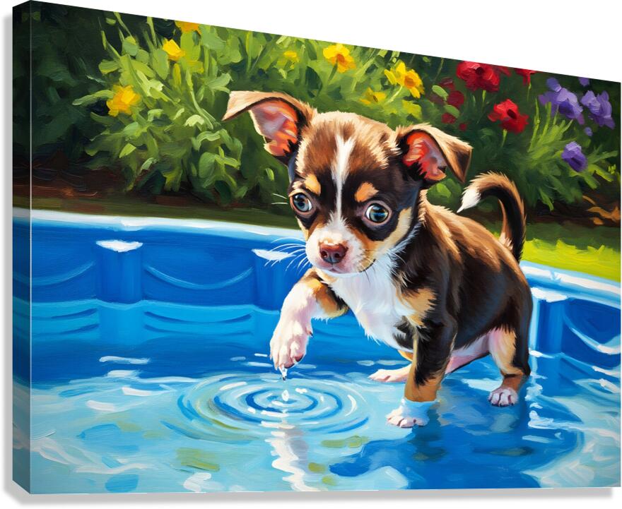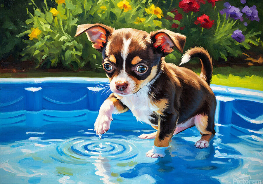 SUR CETTE OEUVRE: CHIHUAHUA PUPPY DISCOVERS THE POOL
