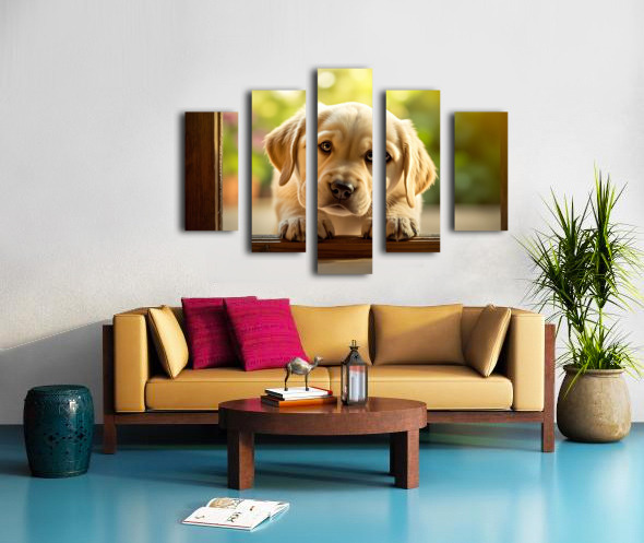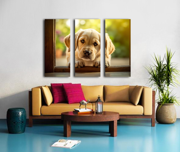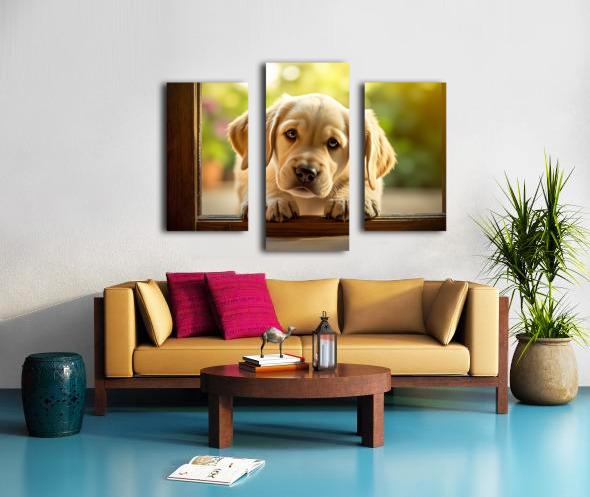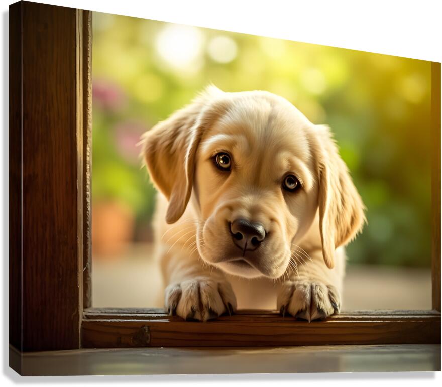 Curious Puppy Discovers Cat Flap Door Impression sur toile