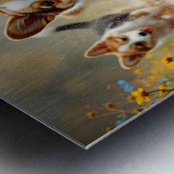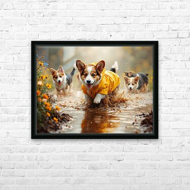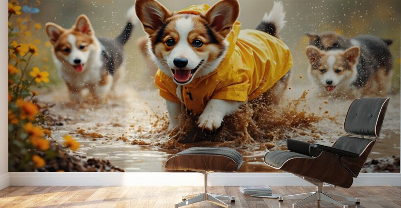 A adorable tricolor Pembroke Welsh Corgi puppy wearing a cheerful yellow raincoat stands with other puppies all prepared for wet weather fun in a park setting with muddy ground beneath their paws. Digital Artwork.