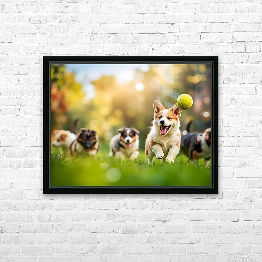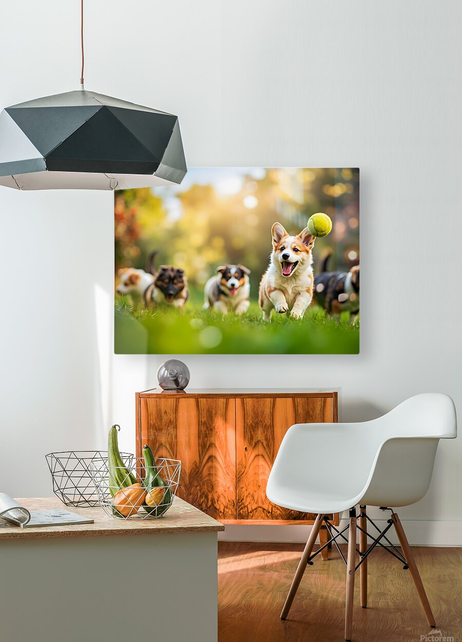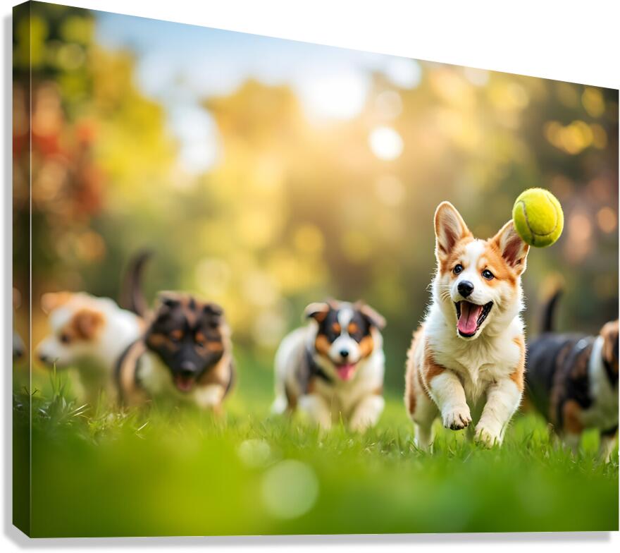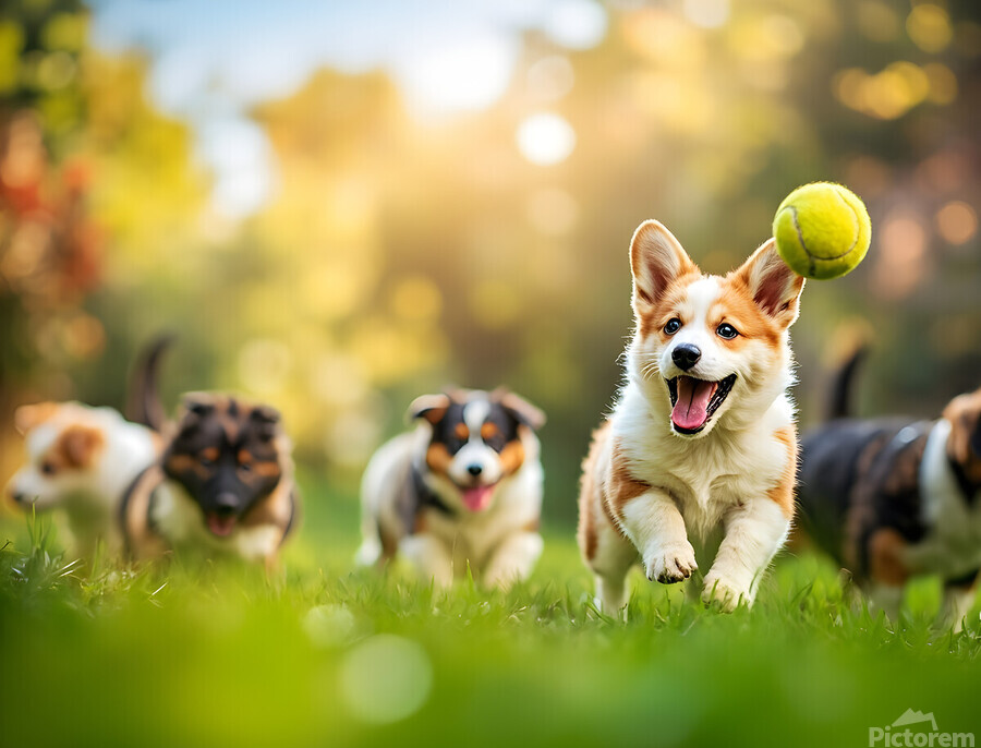SUR CETTE OEUVRE: CORGI PUPPY SPOTS TENNIS BALL IN GARDEN