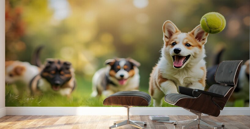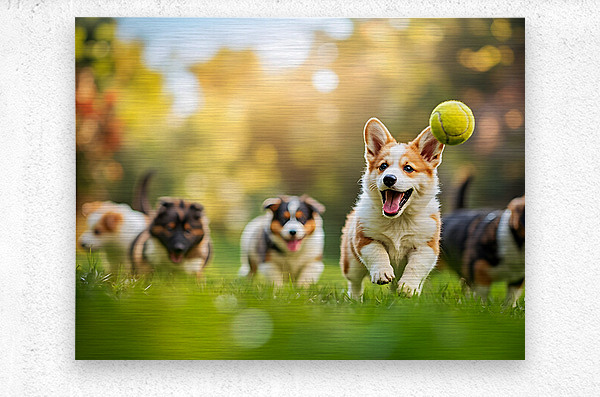 An adorable orange and white Pembroke Welsh Corgi puppy with characteristic short legs and pointed ears races across lush green grass toward a bright yellow tennis ball surrounded by a beautiful garden setting with soft-focus flowers Digital Artwork.