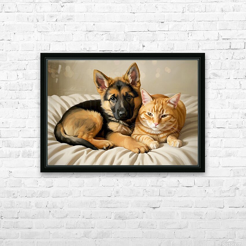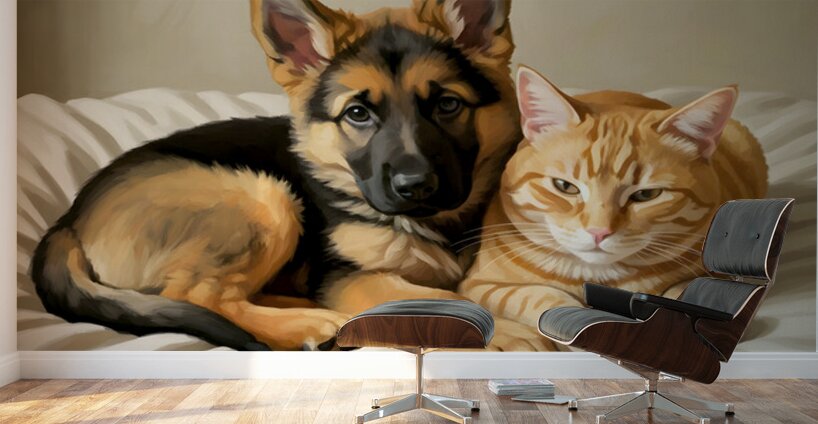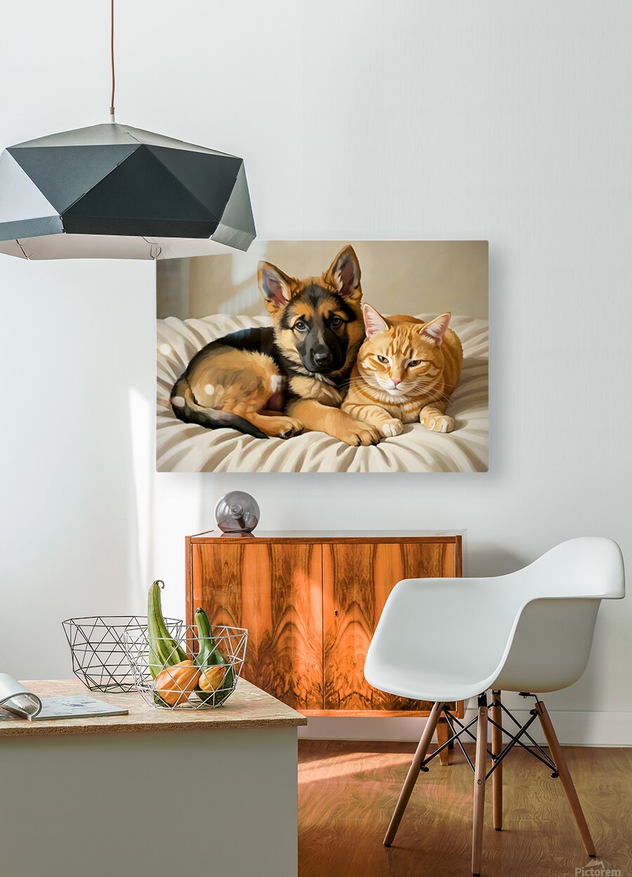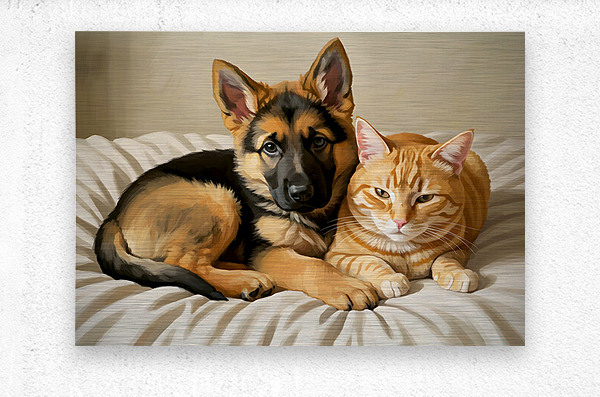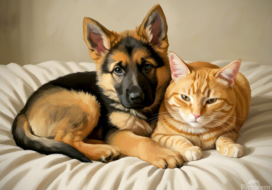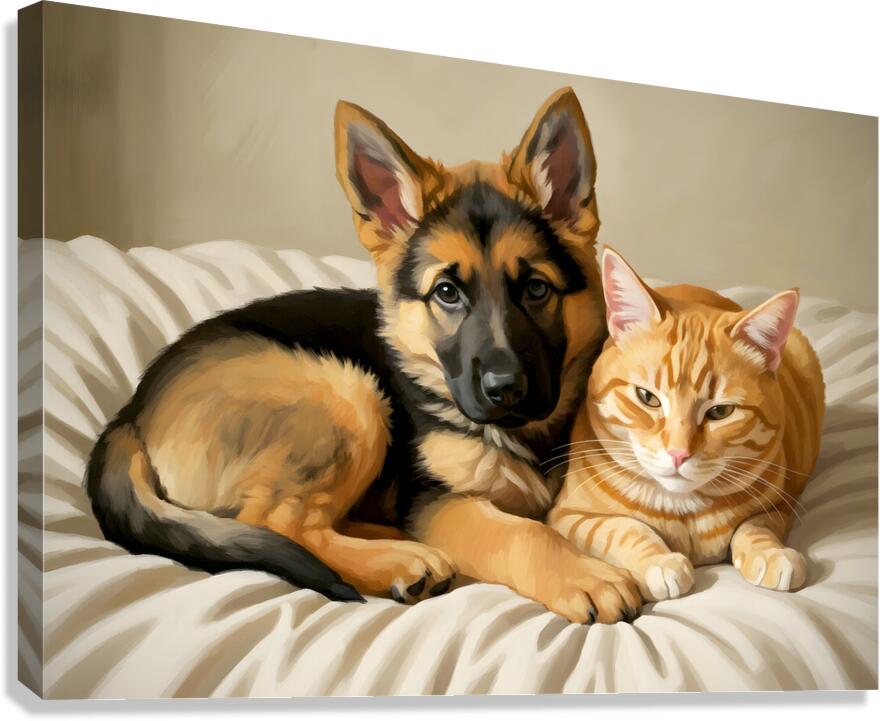 SUR CETTE OEUVRE: GERMAN SHEPHERD PUPPY SNUGGLES WITH CAT FRIEND