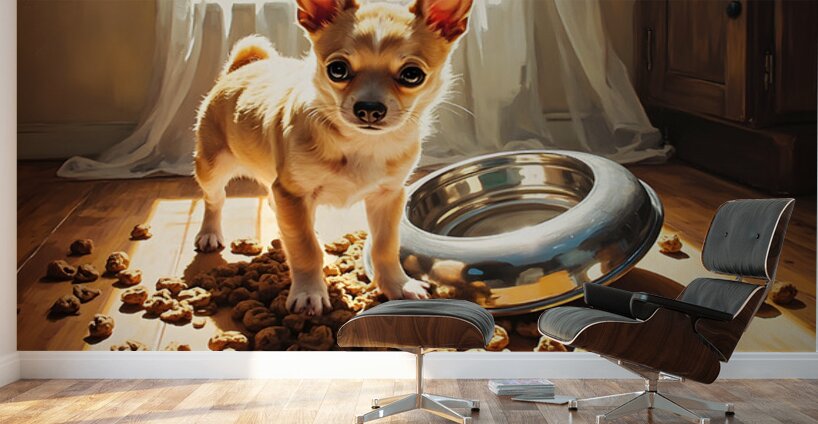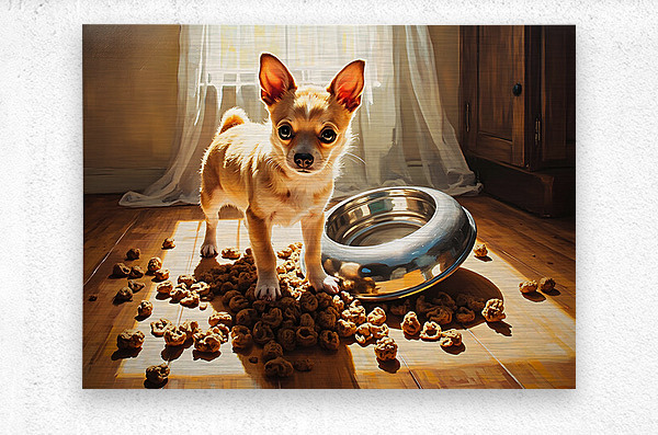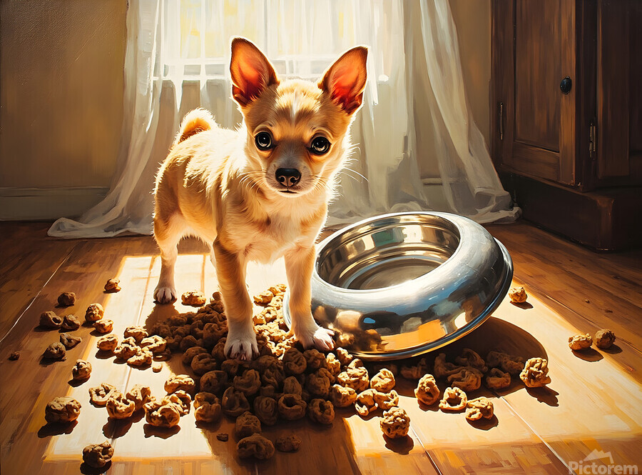 The adorable tan and white Chihuahua puppy sits surrounded by scattered brown kibble on wooden flooring looking up with big guilty eyes while the empty overturned bowl lies nearby. Digital Artwork.