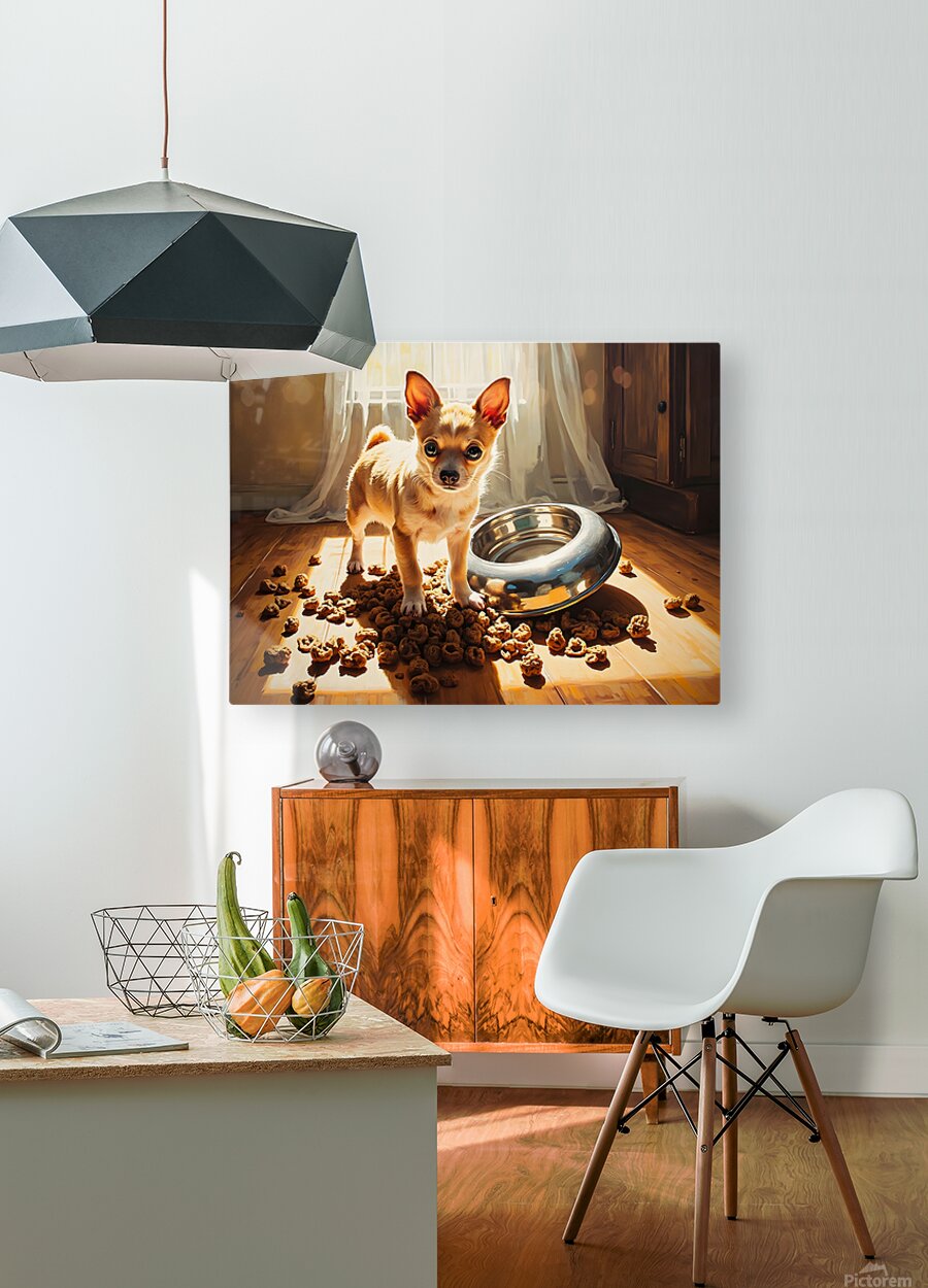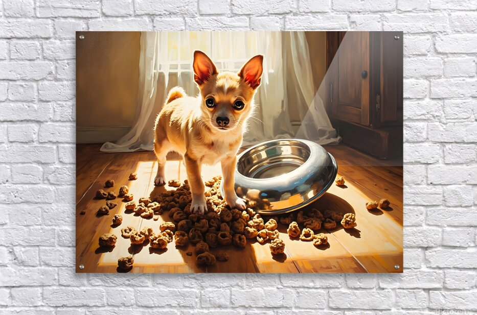 SUR CETTE OEUVRE: GUILTY CHIHUAHUA PUPPY AFTER FOOD MESS
