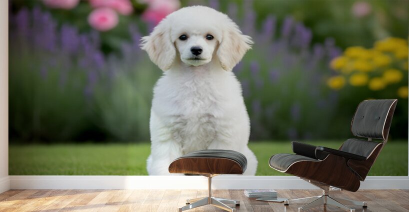 A victorious white poodle puppy sits with pride and accomplishment having successfully mastered the stay command. The fluffy puppys posture radiates confidence and joy with bright eyes showing satisfaction from completing the training exercise in the garden. Digital Artwork.