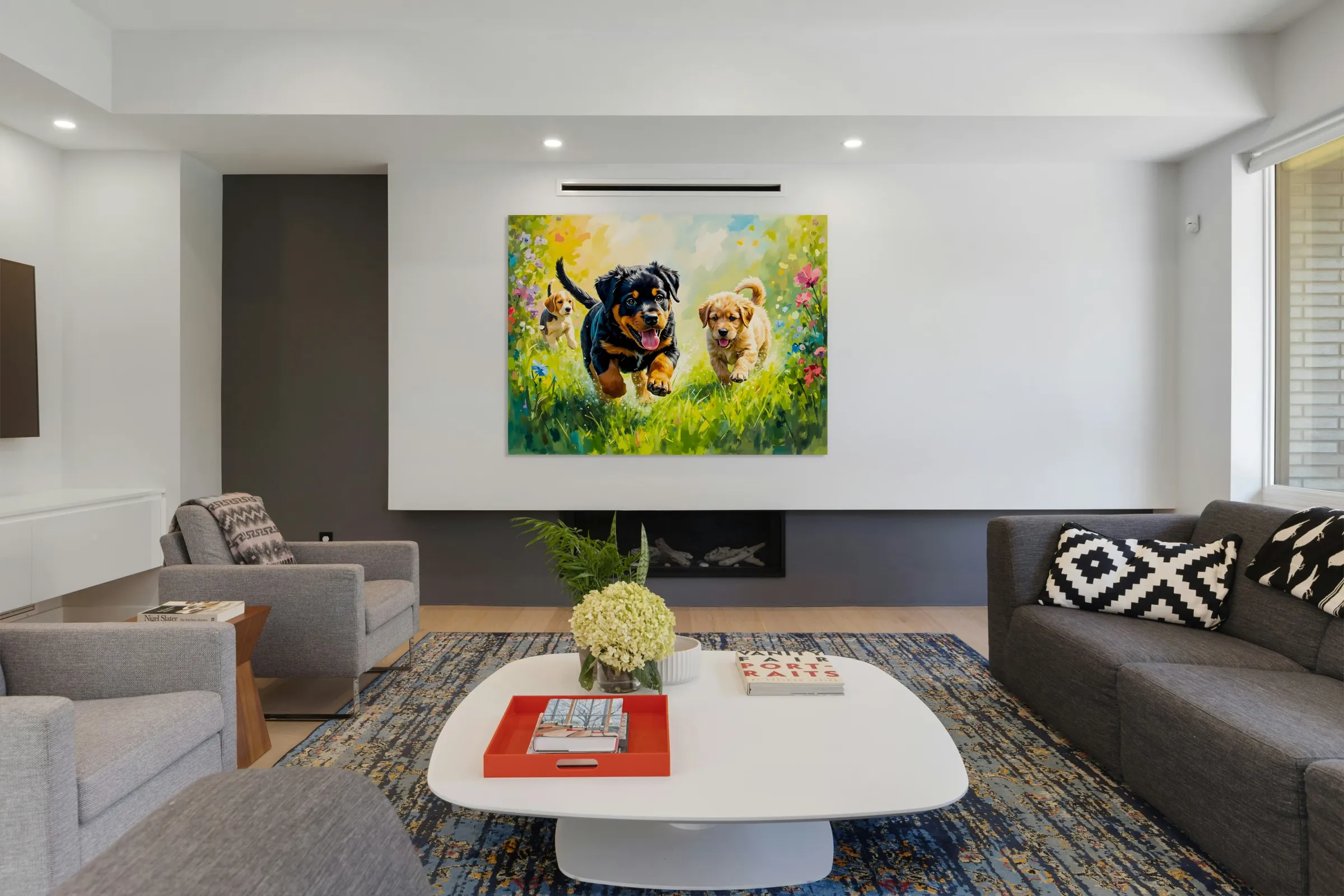 A young black and tan Rottweiler puppy stands eagerly in a backyard setting with three other puppy siblings of various breeds and colors all appearing excited and ready for playtime on the green grass Digital Artwork.