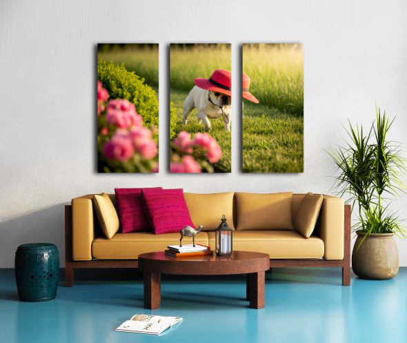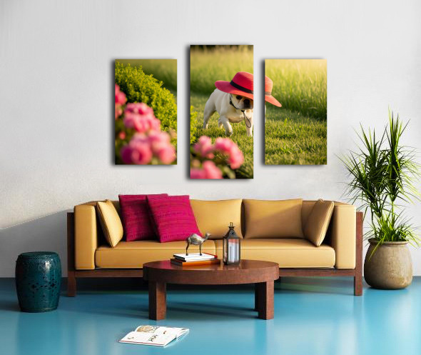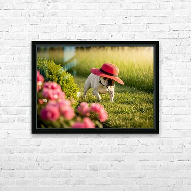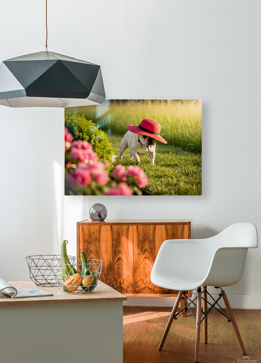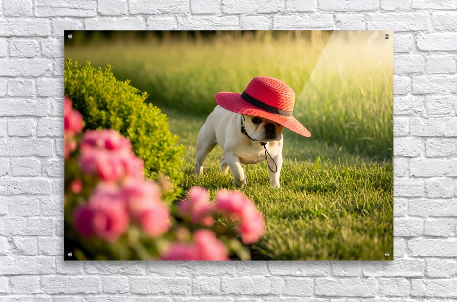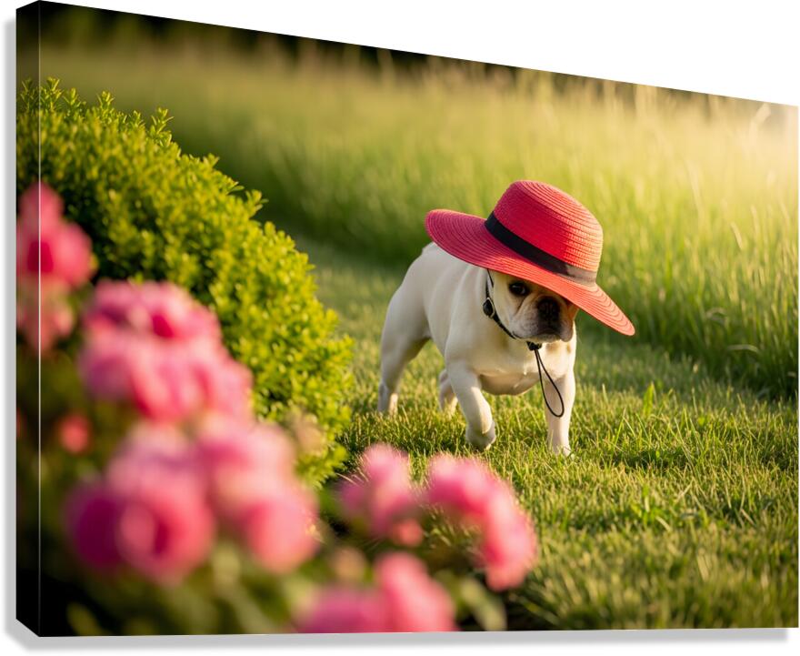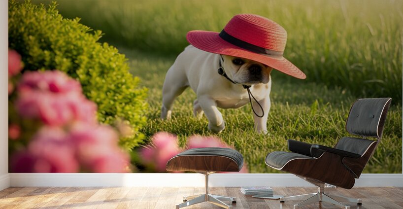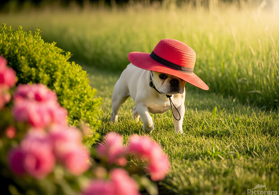 A cream French Bulldog puppy sits in a garden wearing a large red sun hat thats comically oversized for his small head. The hat tilts adorably to one side while colorful wildflowers create a soft blurred background. Digital Artwork.