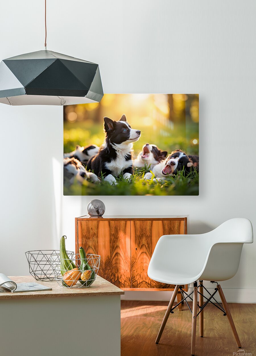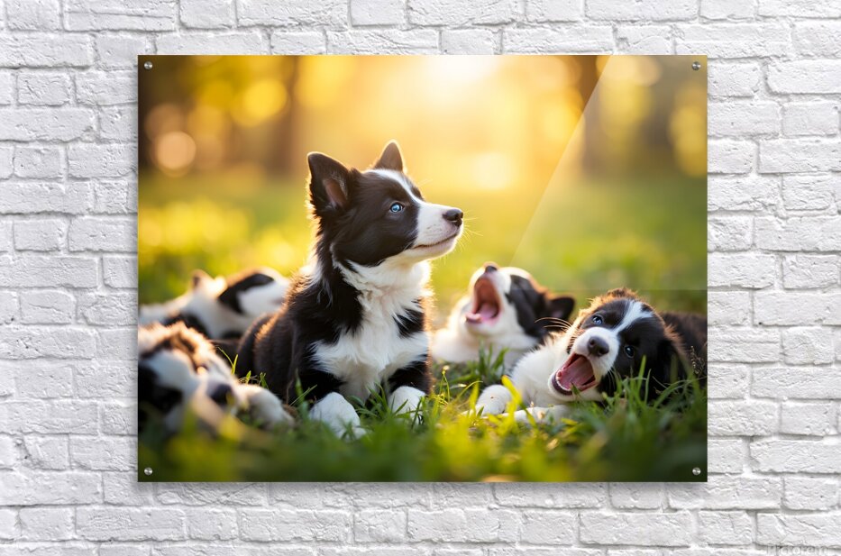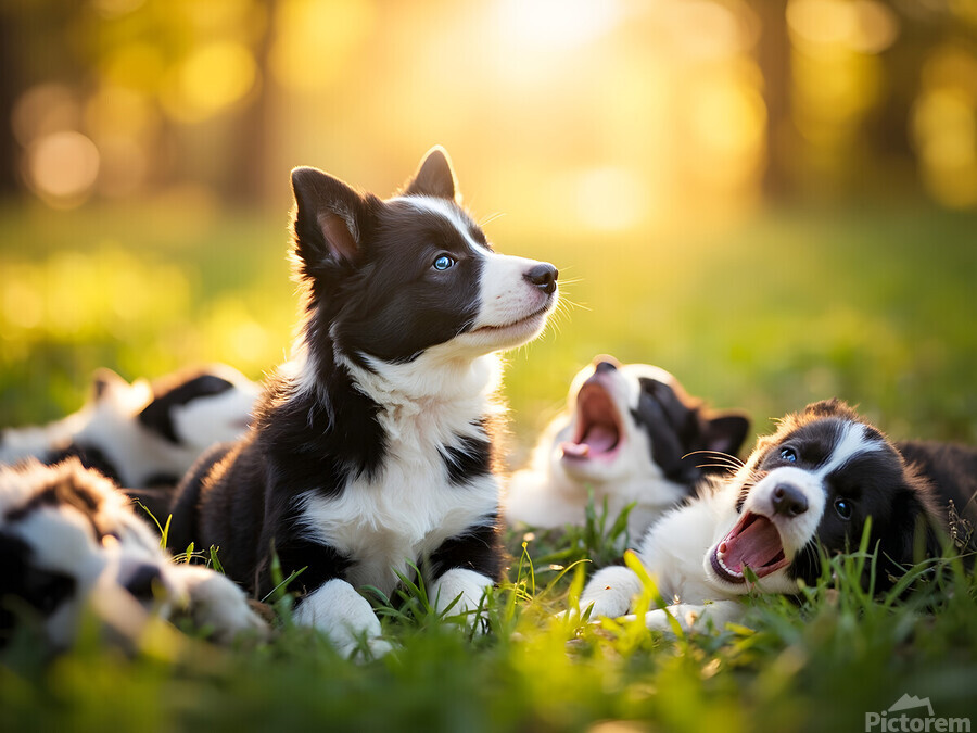 SUR CETTE OEUVRE: SLEEPY BORDER COLLIE PUPPY FINALLY RESTS WITH PACK
