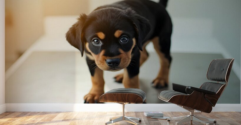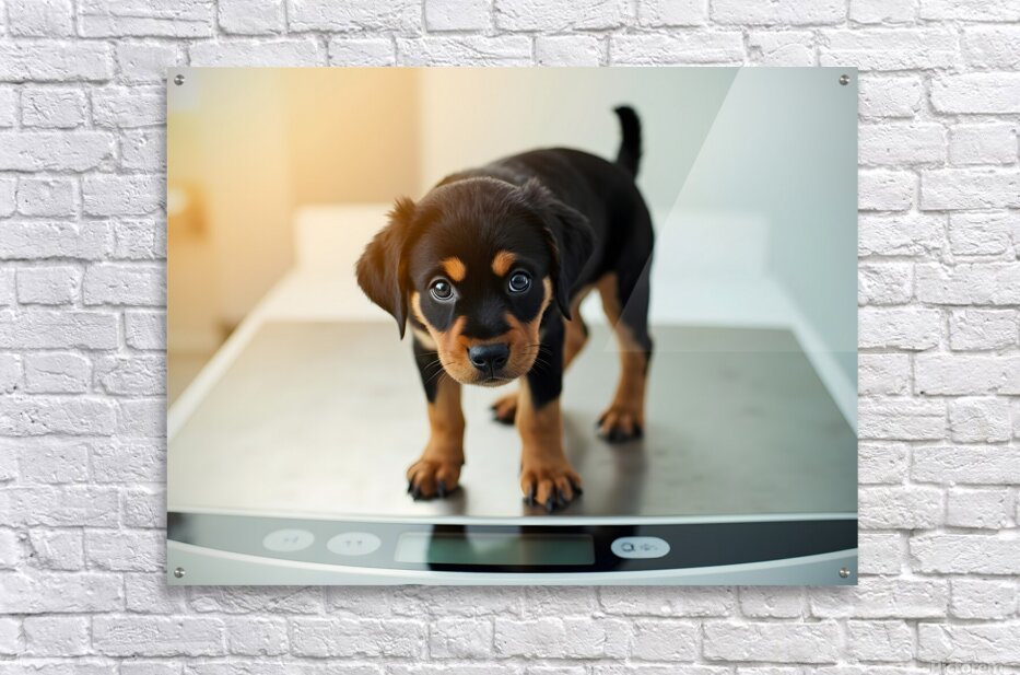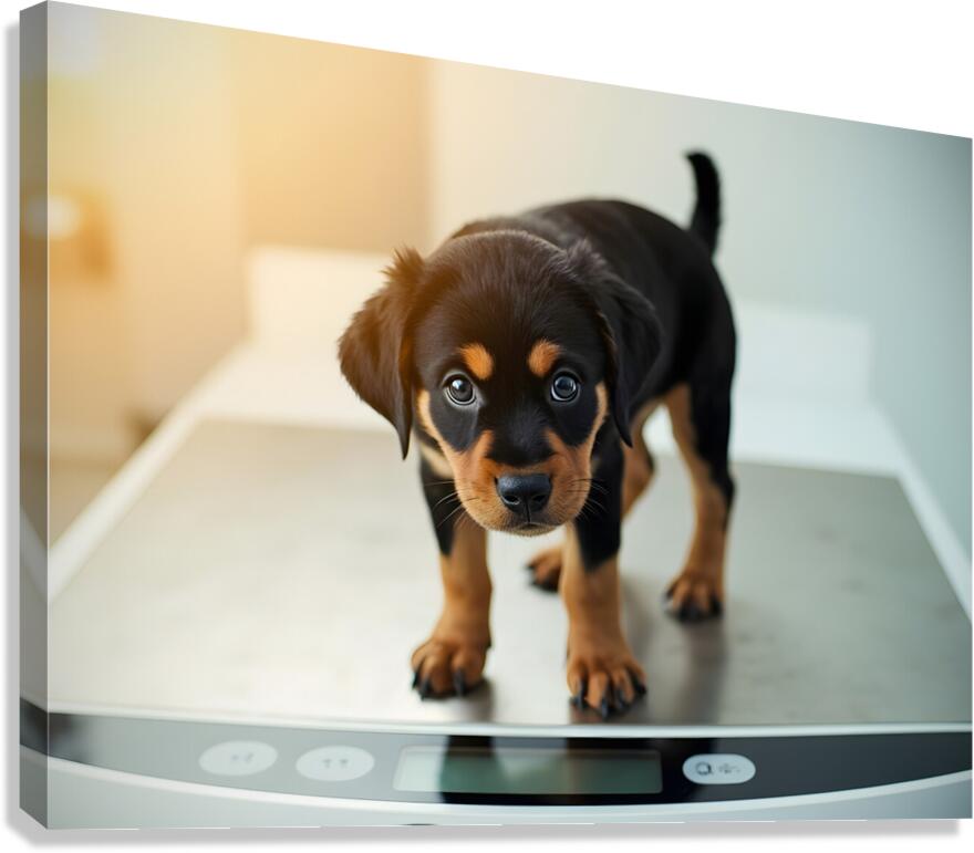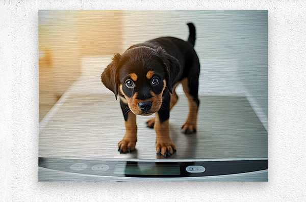 A black and tan Rottweiler puppy sits confidently on the veterinary scale having overcome its initial nervousness. The puppys bright eyes and slightly wagging tail show growing comfort with the weighing process. Digital Artwork.