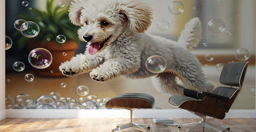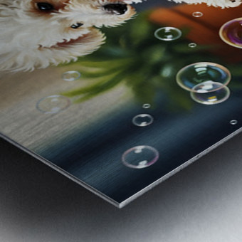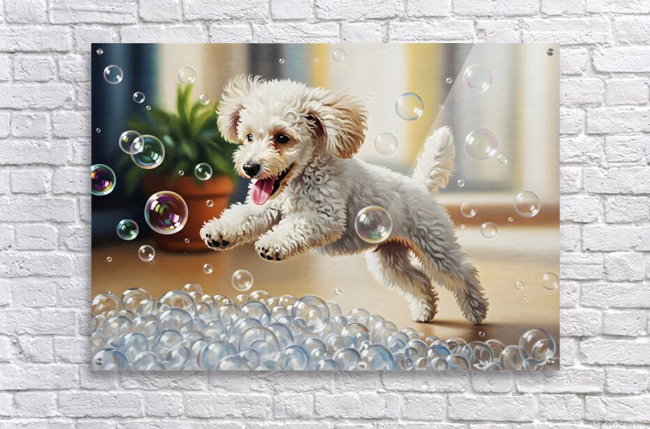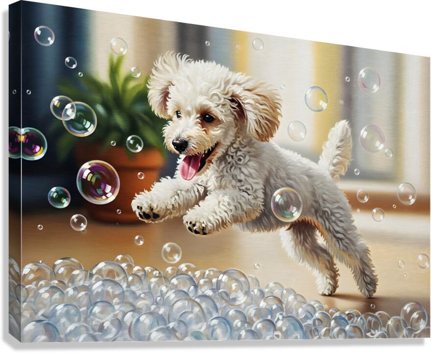 A small white poodle puppy with bouncy curls stands beside a bathtub overflowing with fluffy white soap bubbles looking amazed at the magical foam display Digital Artwork.