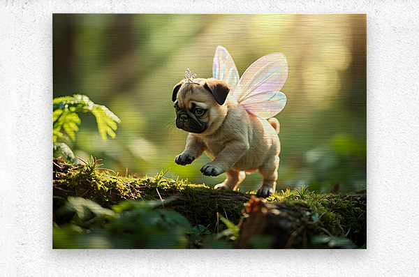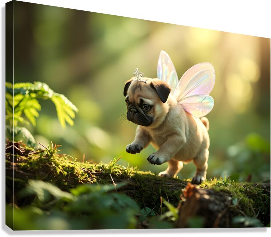 An adorable tan pug puppy wearing shimmering fairy wings and a sparkly silver headband stands in an enchanted garden setting. Purple and pink flowers create a soft out-of-focus foreground while golden sunlight filters through the scene. Digital Artwork.