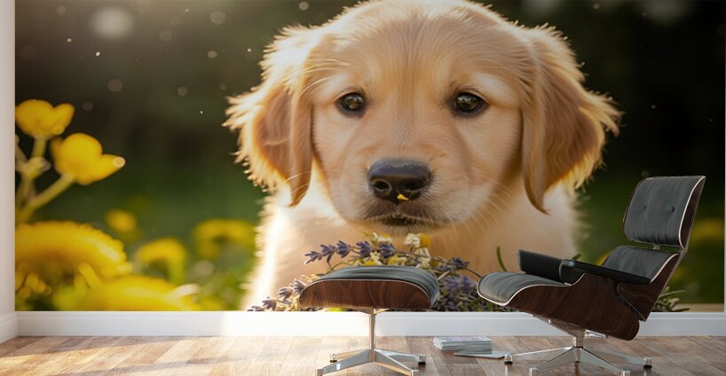 A adorable golden retriever puppy with fluffy golden coat stands near a pile of various dried herbs in a garden setting. The puppy appears curious and alert with soft natural lighting illuminating the scene and blurred purple flowers in the foreground. Digital Artwork.