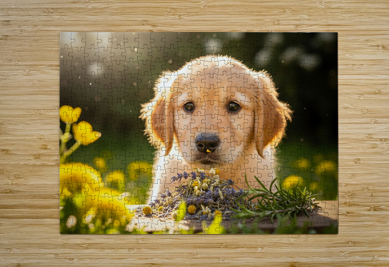 Golden Retriever Puppy Discovers Herb Pile Puppy Prints Impression de puzzle
