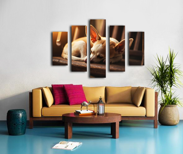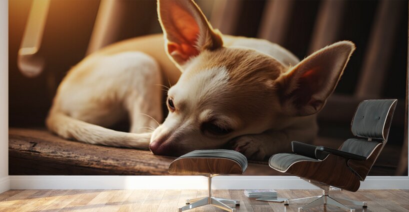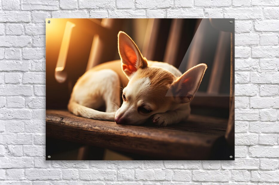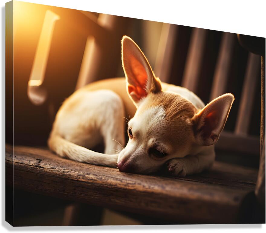 The sweet tan and white Chihuahua puppy sleeps soundly curled into a small ball on the wooden rocking chair. Peaceful breathing and gentle shadows create a heartwarming scene of contentment. Digital Artwork.