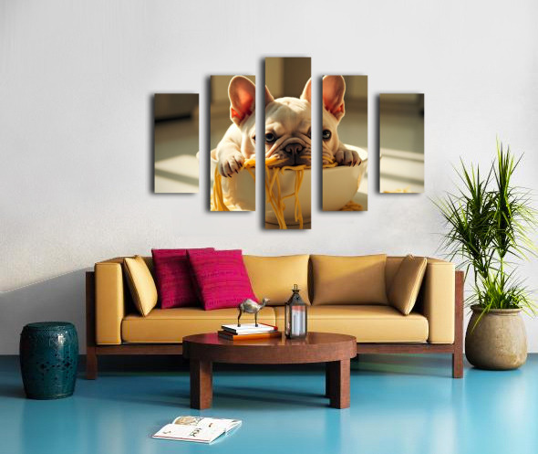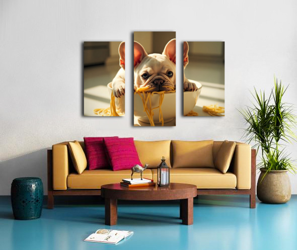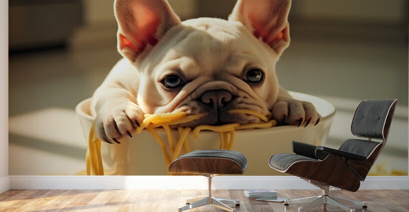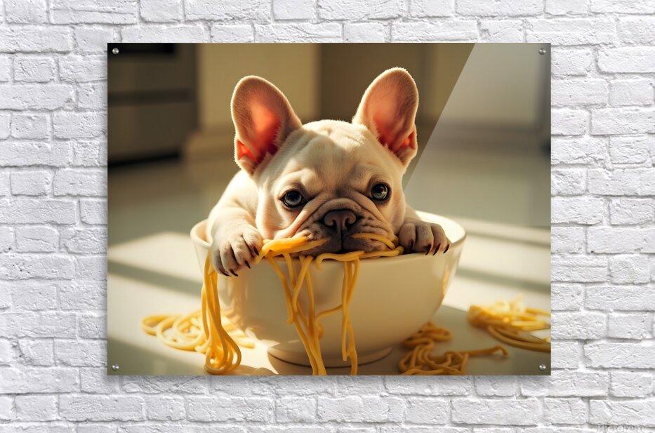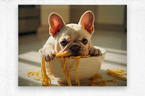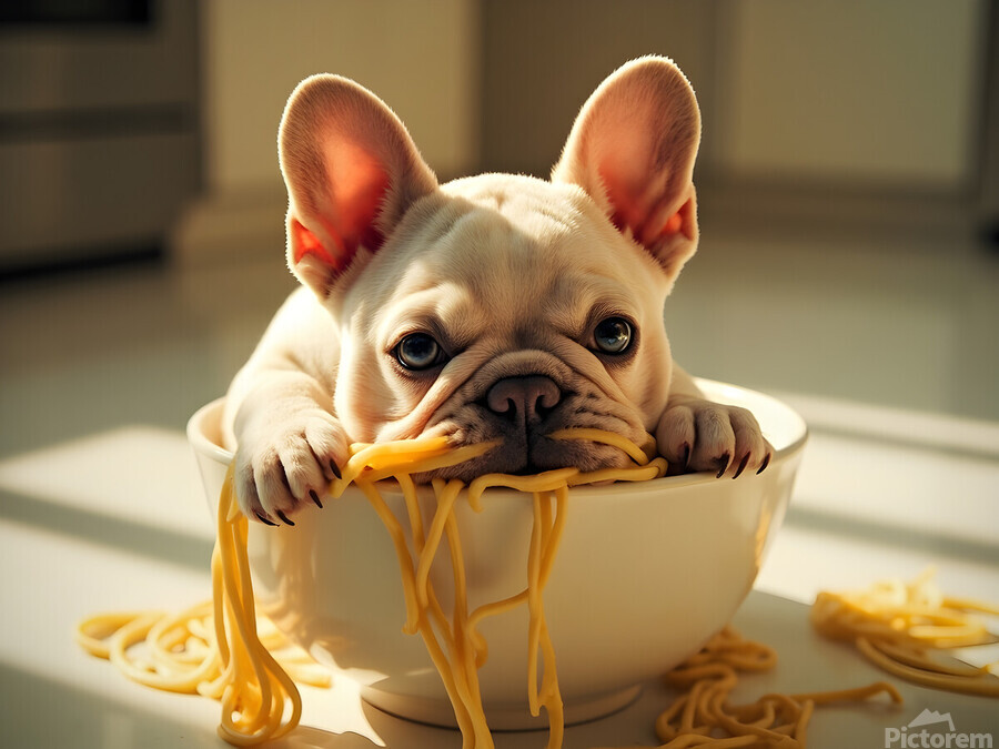 SUR CETTE OEUVRE: FRENCH BULLDOG PUPPY DISCOVERS SPAGHETTI BOWL