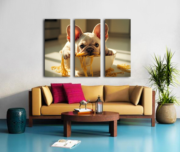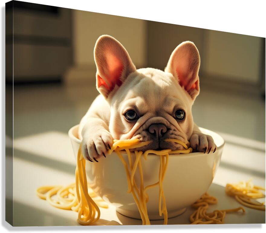 French Bulldog Puppy Discovers Spaghetti Bowl Impression sur toile