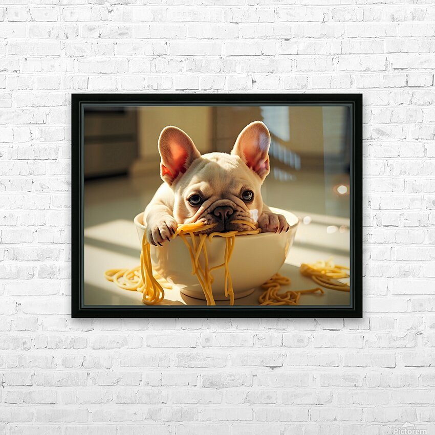 Pour obtenir "French Bulldog Puppy Discovers Spaghetti Bowl" dans une impression encadrée.