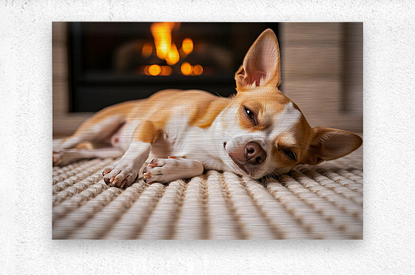 A tiny tan and white Chihuahua puppy sleeps peacefully on a soft pillow small body gently rising and falling with each breath. Red embers glow softly in the fireplace behind casting cozy shadows in the dim room. Digital Artwork.