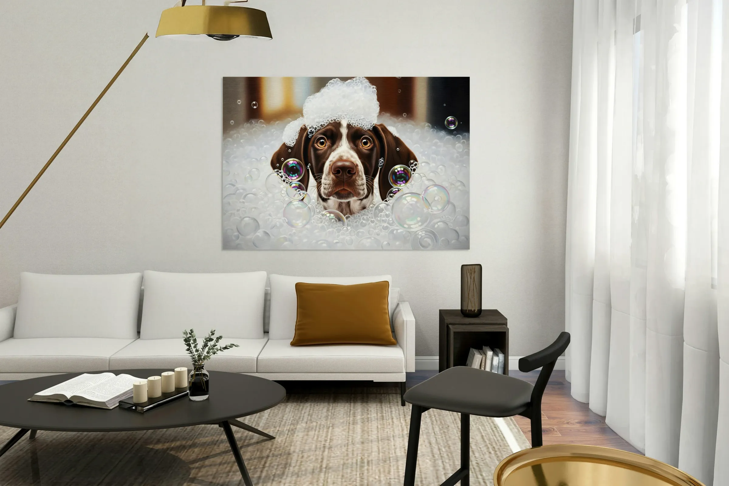SUR CETTE OEUVRE: GERMAN SHORTHAIRED POINTER PUPPY SHAKES OFF THE BUBBLES