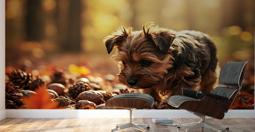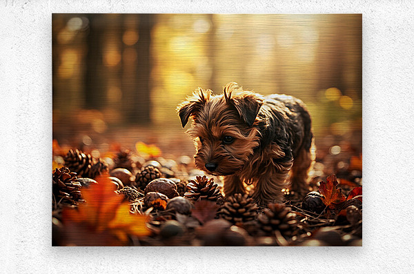 An adorable Yorkshire Terrier puppy with fluffy brown and tan coat sits on a wooden kitchen counter curiously sniffing at scattered cinnamon sticks with its tiny black nose nearly touching the fragrant spices Digital Artwork.