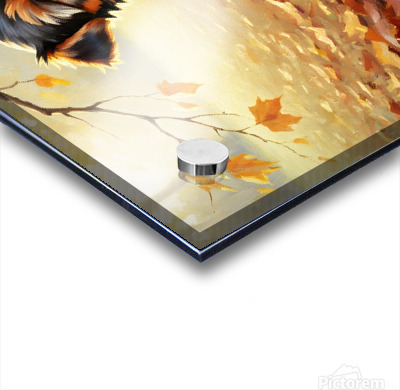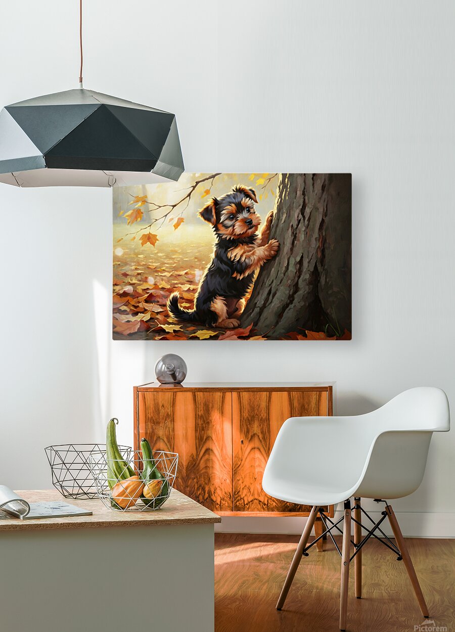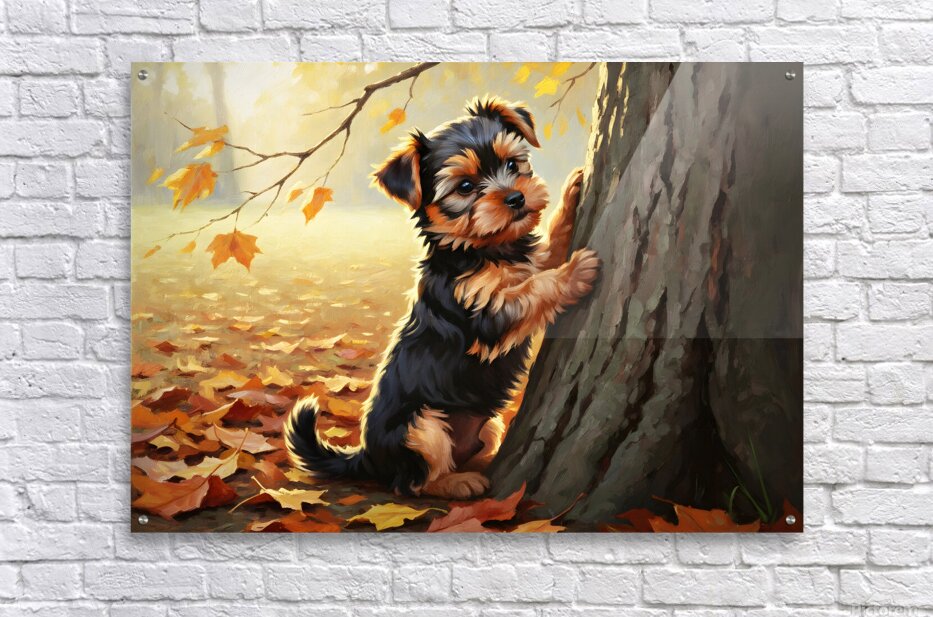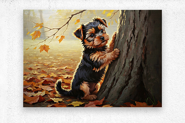 SUR CETTE OEUVRE: YORKSHIRE TERRIER PUPPY SPOTS SQUIRREL AT TREE BASE